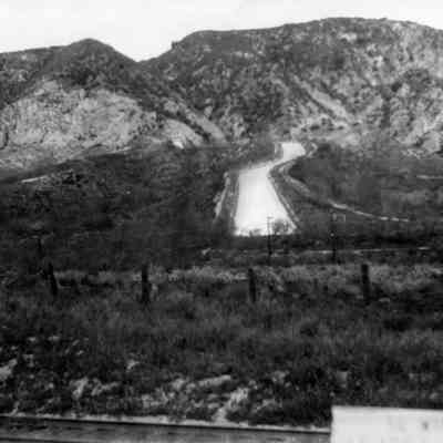 "Aqueduct @ San Fernando Road, 19 teens," ca. 1915. The image, taken from the road next to a railroad track, shows a portion of the aqueduct descending from hills. The land between the road and hills is undeveloped, although there is some fencing and dirt roads. The item is glued to black photo paper and the title is from a pencil inscription on the reverse. With little indication of wear or damage, the condition is good.Lexicon