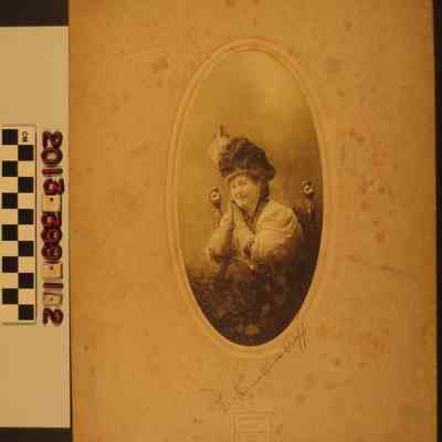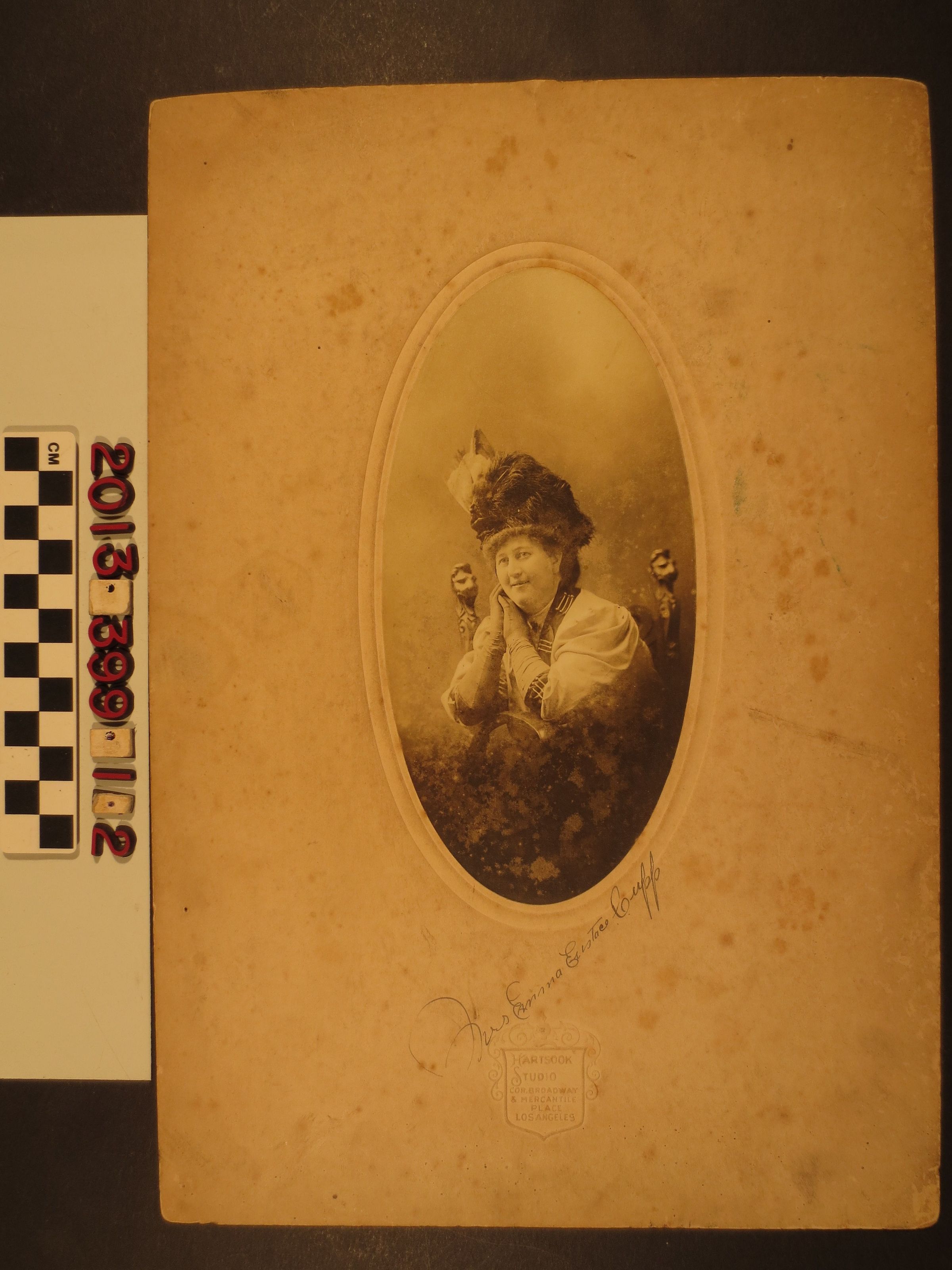 A black and white studio portrait of Emma Eustace Cupp, Los Angeles, December 1907. Emma is seated on a chair with carved heads on the seat back posts. She wears a light colored blouse with dark patterned sleeves and colar and she holds her gloved hands clasped against her right cheek as she looks and smiles at the photographer. She also wears a hat with dark feathers and a white decorative element at the right side. Her name is in ink at the bottom and the date is in ink at the top of the reverse. Hartsook was the photographer and studio. With heavy foxing, soiling and stains, the condition is fair to poor.