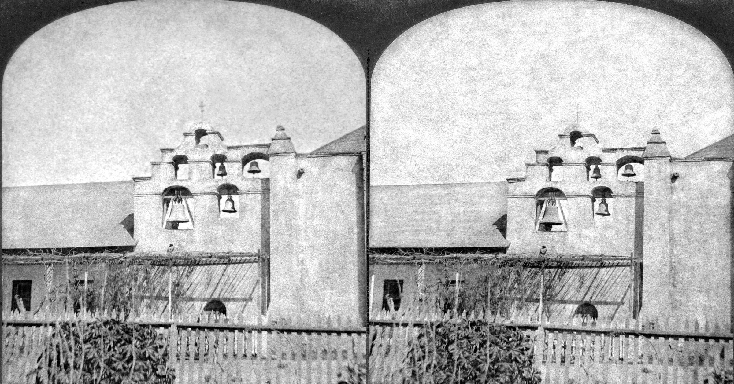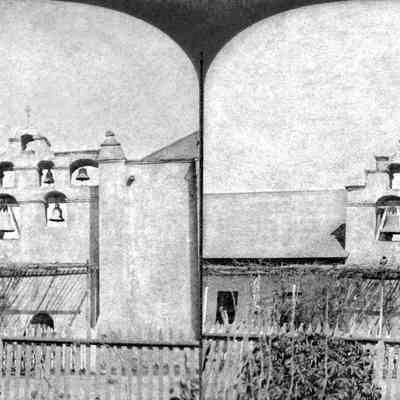 "1002. The Bells of San Gabriel, San Gabriel, Cal," published by Continent Stereoscopic Company, ca. 1878. The image mainly shows the belfry of the old church, which has four of the six bells (the two missing ones later were returned by E. J. "Lucky" Baldwin). There are portions of the church at right and rectory at left. In the foreground is a wooden fence and a trellis in front of the buildings. The caption is at the lower left. The date is derived from an advertisement on the reverse for a book published in 1878. With soiling, edge wear and heavy staining on the reverse, the condition is good overall.Lexicon