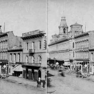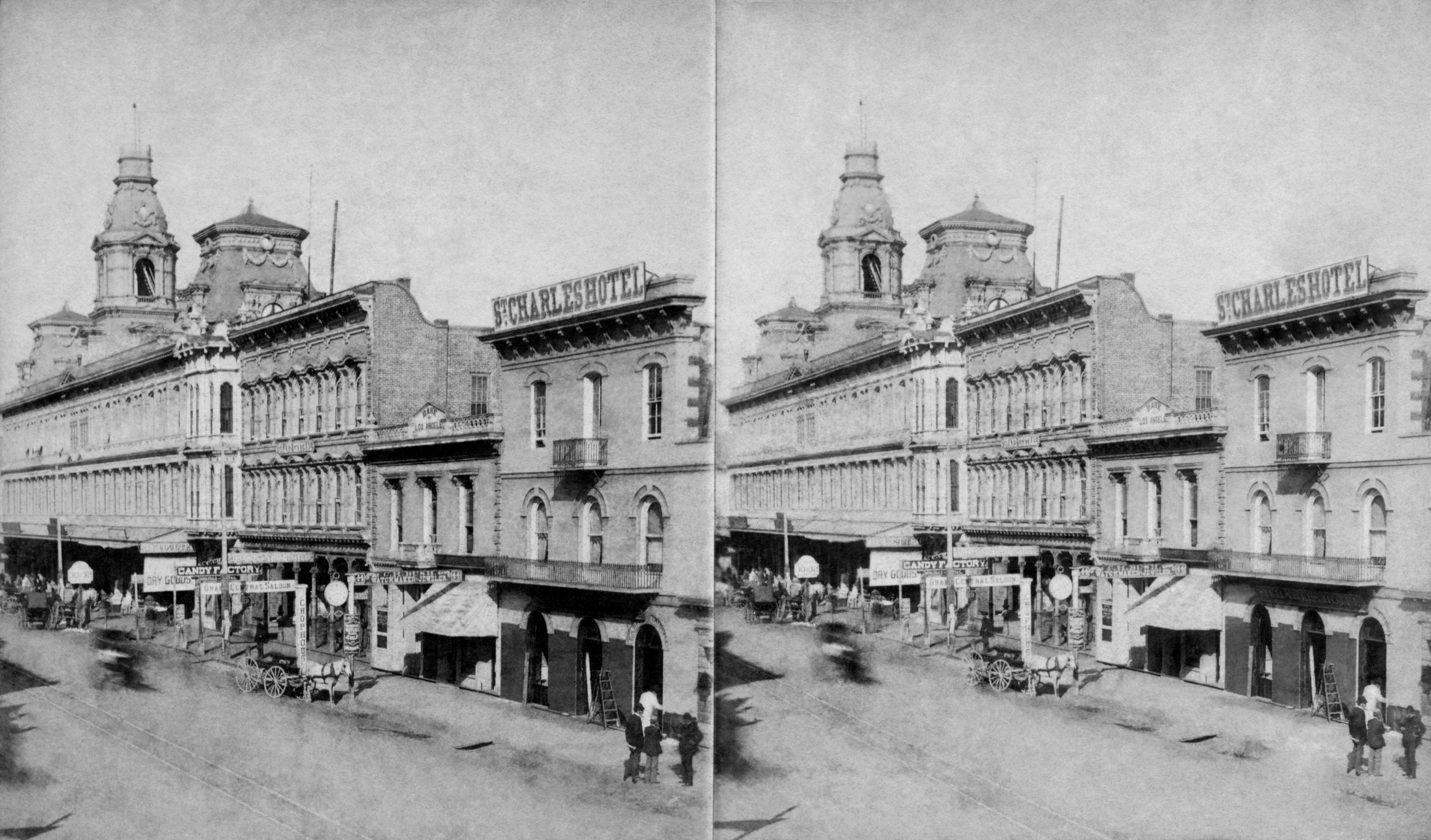 "3131 St. Charles and Grand Centrel [sic] Hotels, L.A.," attributed to Payne, Stanton and Company, ca. 1882. The view is of the east side of Main Street and shows, from left to right, the Arcadia Block, the Grand Central Hotel, the Pico Building (with the "Bank of Los Angeles sign at the peak of the facade), and the St. Charles Hotel. There are some pedestrians, horse-drawn conveyances, storefront signs, and other noteworthy details. On the reverse is a stamp for "Hellman, Stassforth & Co." bookstore and stationery dealers, who originally sold this view. The Pico Building was formerly home of the bank of Hellman, Temple and Company and was built by Pio Pico in 1868. With a white liquid at the lower right of the right image and some soiling on the photo and mount, the general condition is good overall.Lexicon
