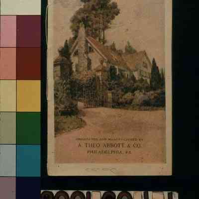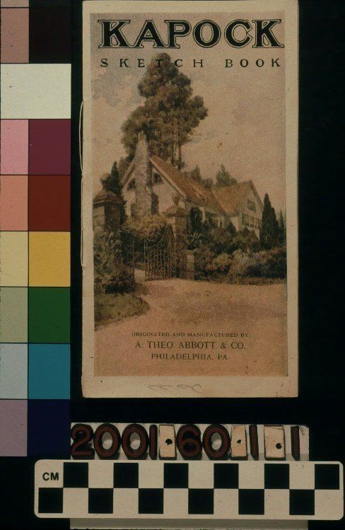 "Kapock Sketch Book," issued by the A. Theo. Abbott & Co., 1922. The 12-page booklet has a paper cover with the title in black at the top of the front. At the center is a color illustration of a two-story home with a fenced yard and tree-filled garden. At the bottom is the name and location of the manufacturer in black. On the top of the back is the black and blue logo of Kapock Fabrics while at the bottom is, "'KAPOCK FABRICS' / are made to a standard / not down to a price." On the back of the front cover is a foreword and, written in pencil on the top of the facing page, is the name of Margaret A. Lions. The artifact provides many color illustrations with descriptions that suggest the use of the manufacturer's fabric as drapery in interior decoration. With light creases; surface soiling; light stains; a tear at the bottom of the spine; and pencil markings throughout the back, the object is in fair condition.Lexicon