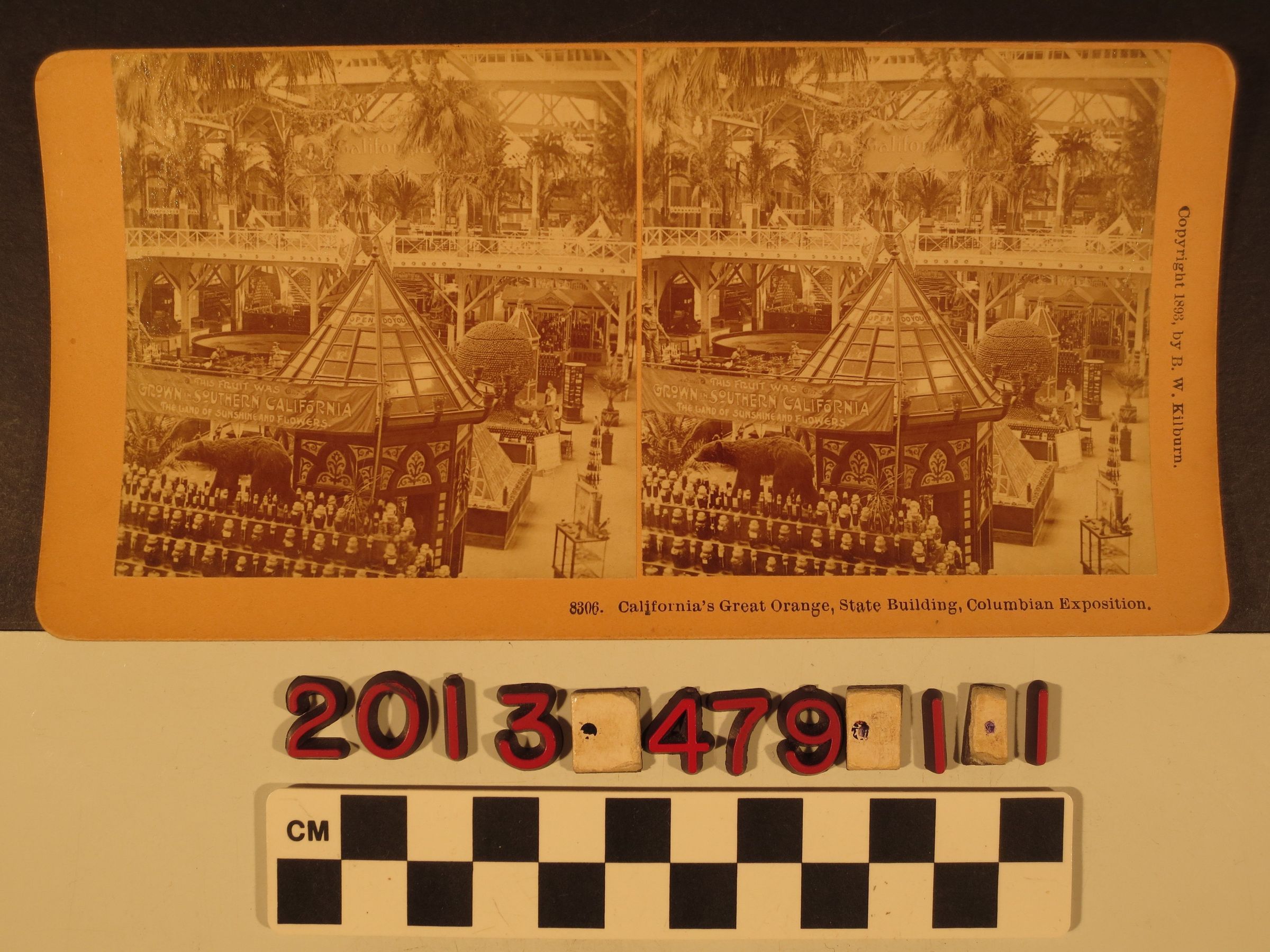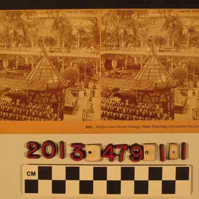A stereoscopic photograph "8306. California's Great Orange, State Building, Columbian Exposition," Benjamin W. Kilburn, 1893. The elevated view, from a second-floor walk in the cavernous hall looks down upon the exhibit with a banner reading "This Fruit Was / Grown in Southern California / The Land of Sunshine and Flowers" over a tiered display of what appears to be preserved fruit in large glass jars. A gazebo with a cylindrical roof, a display of a large orange and base made of oranges, what appears to be a stuffed grizzly bear and other elements compose the exhibit. In the distance behind another elevated walkway is a banner reading "California." The exposition commemorated the 400th anniversary of Christopher Columbus' voyage to the Americas, was held in Chicago from 1 May to 30 October. With a stain on the reverse, minor soiling and moderate abrasion and fading, the condition is good to fair.Lexicon