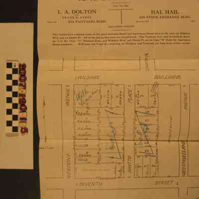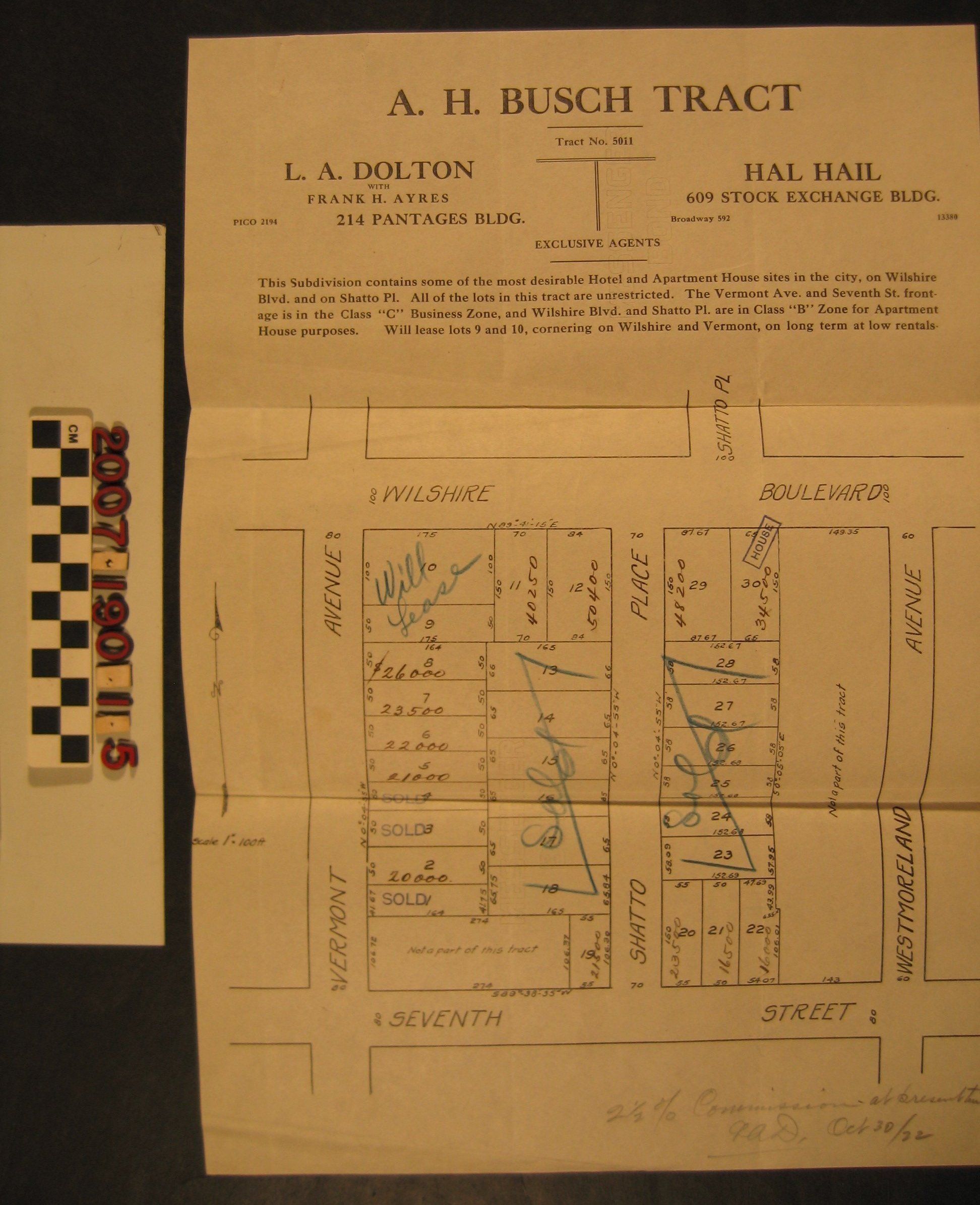 "A. H. Busch Tract, Tract No. 5011," Los Angeles, about 30 October 1922. The map shows a tract of twenty-eight lots between Wilshire Boulevard on the north, Seventh Street on the South, Vermont Avenue on the west, and Westmoreland Avenue on the east, with Shatto Street running through the center. The names of tract agents, information about zoning and leasing for some lots, and other material is at the top. There are inscriptions for sold properties, values for remaining lots, and a dated note at the bottom about commissions. With folds, creases, a small tear at the top, and a mark from a paperclip, the overall condition is good.Lexicon