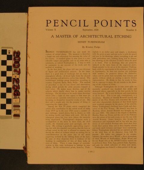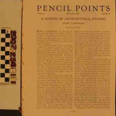 "Pencil Points," September 1929 (Volume X, Number 9). The magazine has technical articles on architecture specifically intended for the draftsperson. In addition to indsutry-wide articles, there is part one on the history and architecture of the California Missions by Natt Piper of the State Association of California Architects, focusing on the missions San Fernando and San Juan Capistrano with photos, sketches, and plans. Part two is in item .2 of this accession. Lacking its wrappers, but with clean pages, the overall condition is poor.Lexicon