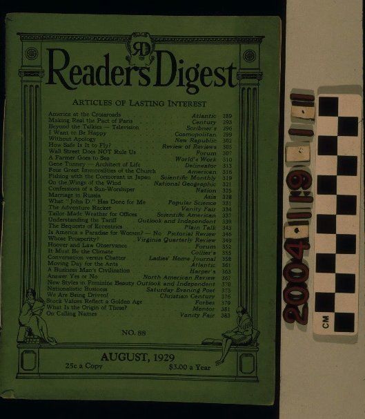 "Reader's Digest," Vol. 8, No. 88 (August 1929), published by The Reader's Digest Association, Inc. The item has a green cover with the title at the top, a list of articles at the center, the number at the bottom, below which is the month and year and issue and subscription prices. All of these are within a border with classic columns, figures reading and other designs reminiscent of Greek or Roman classicism. The 95-page publication has thirty-three condensed articles on American politics, television, air travel, business and Wall Street, sports, foreign countries, women, the Hoover Administration, women and beauty, and others from such publications as Atlantic Monthly, Scribner's, the New Republic, National Geographic, the Nation, Popular Science, Vanity Fair, Collier's, ladies' Home Journal, Harper's, Saturday Evening Post, Forbes, and others. Short biographical statements of authors are on the inside back cover. With acid burns on the cover, light cover creases, cover soiling, page and cover yellowing, some signs of foxing on pages, cover stains, fingerprints on pages, staple tarnish, and small cover tears, the overall condition is good.Lexicon