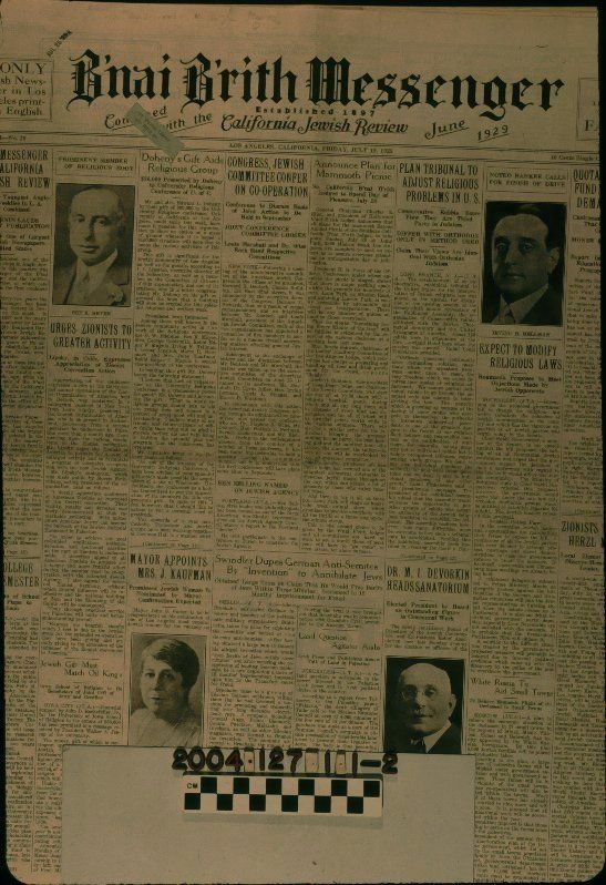 Ten issues of "B'nai Brith Messenger" combined with "California Jewish Review," October 4 through December 27, 1929. The disbound set of issues, which is missing one issue from its run, has the title at the top center, location and phone number at the right, and statement, at the left, that the paper was the only English-language Jewish newspaper in Los Angeles. Below are the volume and number (Vol. 31, Numbers 40-52), city, state, and date, and single copy and subscription rates. Each issue is twelve pages and contains local, national, and international (particularly matters pertaining to Zionism and Palestine) news, as well as business, social, entertainment, sports, and other features. There are some photographs, mainly of individuals, and many advertisements in the issues. Item 1.1 comprises the run from July 19. In fair condition, the run generally has brittleness, surface soiling, browning, looseness from the disbinding, losses along edges, and edge tears.Lexicon