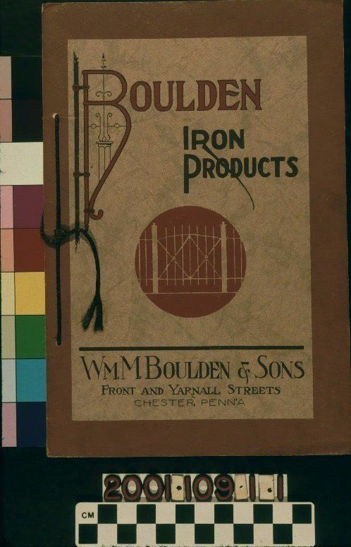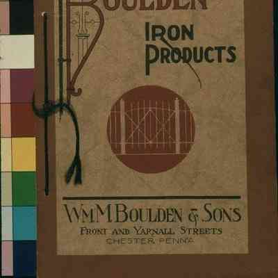 Color: Brown; Red "Boulden Iron Products," issued by William M. Boulden & Sons, ca. 1910. The 17-page catalog is bound with brown yarn and has a tan cardstock cover. The title is at the top of the front in red and dark-brown lettering. Within a red circle at the center is a drawing of a gate. The name and address of the manufacturer are at the bottom in dark brown. A light brown border is around all of the latter. Listed inside are posts; a variety of fences; balcony railings; gates; handrails; pickets; cellar doors; and grandstands. Many line-drawings are included. With light abrasions; small creases; slight dents at the corners; light soiling; and small stains on the back, the artifact is in good condition.