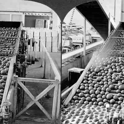 (45), Oranges 11. Washing Oranges in 'Stamm Washer' in Modern Citrus Fruit Packing House, Lamanda Park, Calif