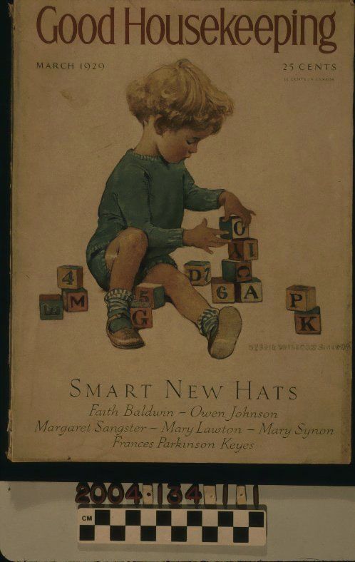 "Good Housekeeping," published by the International Magazine Company, Inc., March 1929. The 316-page magazine has with the title, date, and price at the top of the front. At the center is a color illustration of a toddler playing with wooden alphabet blocks. At the bottom is a title of a featured article and the name of six contributing authors and the name of the cover artist, Jessie Willcox Smith, is at the bottom right. Contents include an editor's page; eight pieces of fiction; eight special articles on marraige, fathers, dogs, the sister of the Vice-President, and new books among others; five items in the "Good Housekeeping Institute" involving home economics issues; four items in the "Good Housekeeping Studio" concerning house decorating; an article on children; an article on a proposed national institute of health; six special service features; four items of poetry; and several fashion-related pieces. There are many photographs and drawings, and advertisements for household goods are also included. In good condition, the artifact has spine rubbing; acid burns on the last page from contact with the back cover; light cover creases; small dents at the top right corner of the front cover; surface soiling on the cover; page yellowing; losses at the top and bottom of the spine; cover stains; and tears on the cover edges and top and bottom of the spine.Lexicon