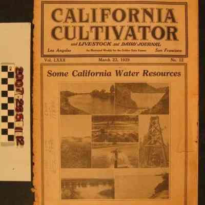 "California Cultivator," 23 March 1929 (Vol. LXXII, No. 12), published by Cultivator Publishing Company, Inc, Los Angeles. The item covers the farming, livestock, and dairy industries and has some photographs as illustrations as well as industry-related advertisements. With the front wrapper separated, edge browning, edge tears, some stains and soiling, and edge wear, the condition is poor.Lexicon