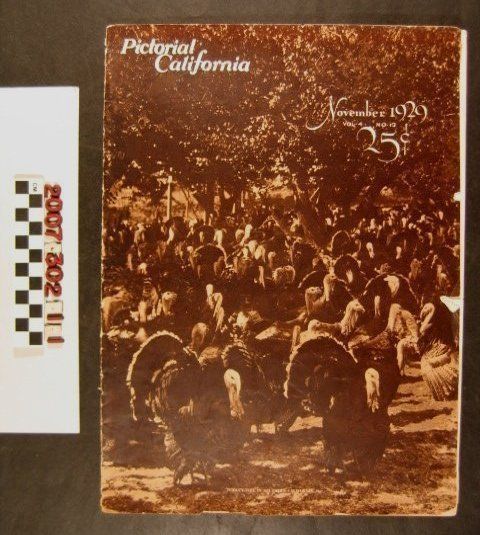 "Pictorial California," November 1929 (Vol. IV, No. 12), published by Eugene Swarzwald, Los Angeles. The rotogravure publication has large photographs ofa USC-Stanford football game, views of outdoor southern California scenes, buildings in San Diego, Palm Springs, the Lick Observatory near San Jose, Atascadero, the Los Angeles County Fair, and the home of actress Irene Rich, most accompanied by captions and a little text in some places. With the wrappers detached and edges torn and bumped, but generally clean pages, the condition is poor.Lexicon