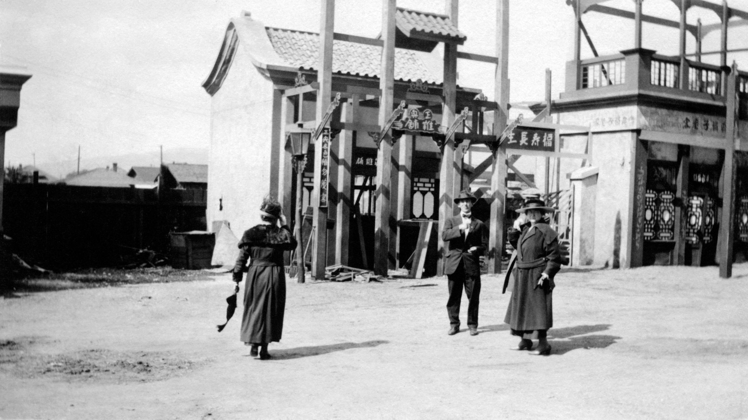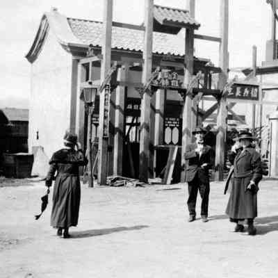 "At the Metro Studio," 19 February 1919. The image is of four persons, identified by first name on the reverse, standing amidst a Chinese village set on the lot. Metro Pictures was sold in 1920 to Marcu Loew of the famed theater chain and then amalgamated into MGM by mid-decade. The lot became "Motion Picture Studios", Desilu in the 1950s and 1960s, and is now Ren-Mar on Cahuenga, north of Melrose, in Hollywood. With curving of the paper, some light soiling, and mounting paper residue on the reverse, the overall condition is good.Lexicon
