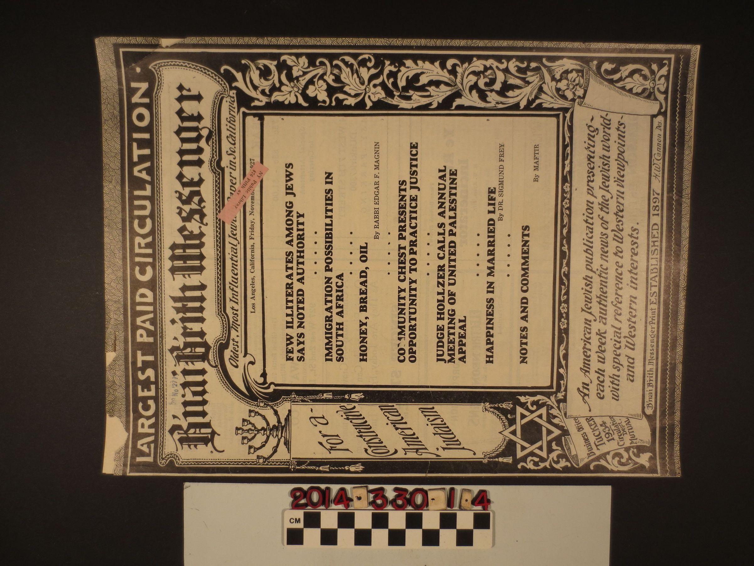 "B'nai B'rith Messenger," Los Angeles, 25 November 1927. Fifteen pages include articles on Happiness in Married Life, the Community Chest, and immigration to South Africa, among other things and have advertisements for various goods and services. "B'nai B'rith Messenger" is boasted as being the oldest and most influential Jewish paper in Southern California. The newspaper was previously bound. With tears, pieces missing, and is missing nine pages, the object is in good overall condition.Lexicon