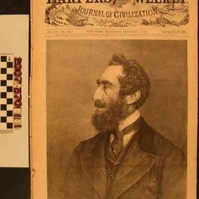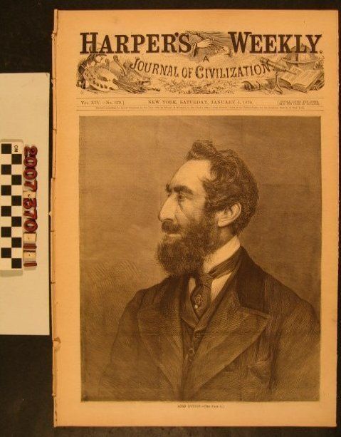 "Harper's Weekly," Vol. XIV, No. 679 (1 January 1870), published by Harper & Brothers, New York. The item contains general news, literature, and other items of current interest and there is material relating to Christmas, including a short article about Christmas trees accompanied by an illustration of a family around one. There is also an illustration of the nativity. As disbound, the pages are loose and there are some tears, soiling, and browning, but the condition is fair overall.