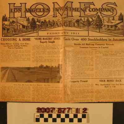 "Homes of Los Angeles," published by Los Angeles Investment Company, February 1911. The publication features booster articles on real estate and development, highlighting the company's projects in the region. Also included are a monthly report and financial statement and photographs of bungalows and cottages for sale, all in south Los Angeles. With dogeared corners, tears (including a large one on the front on the horizontal half fold), creases, stains, and soiling, the condition is poor.Lexicon