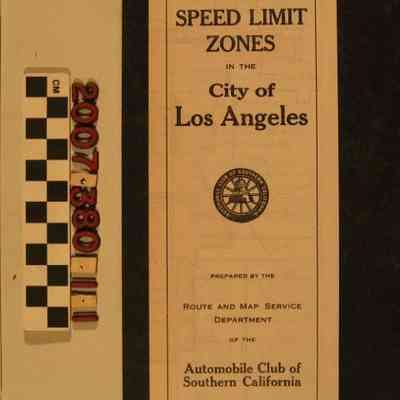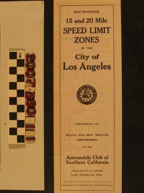 "Map Showing 15 and 20 Mile Speed Limit Zones in the City of Los Angeles," Route and Map Service Department, Automobile Club of Southern California, probably 1923. When fully opened, the item shows much of the city limits with an area colored and outlined in red constituting the 20 mile per hour zone and areas in green, mainly in downtown, and some main arterial roadways outside it, as 15 mile per hour zones. Pictorial examples of street signs are included. Other features include reminders for drivers, hand signals for turning or stopping, braking times for certain speeds, and club information. With some edge rubbing and a few creases, but clean overall, the condition is good.Lexicon