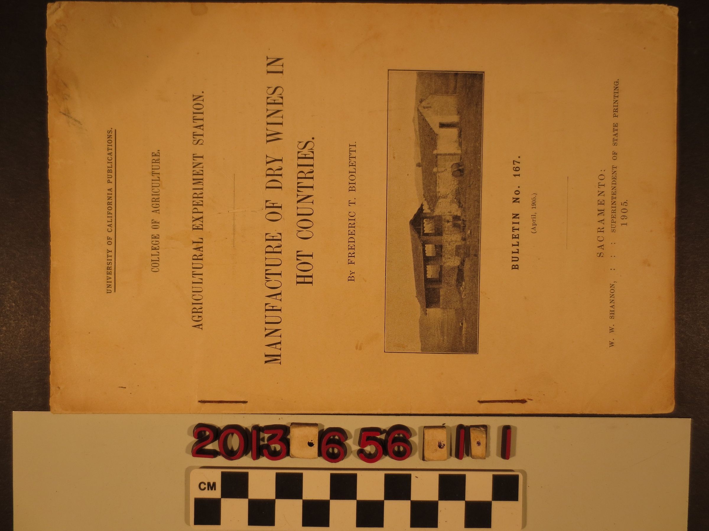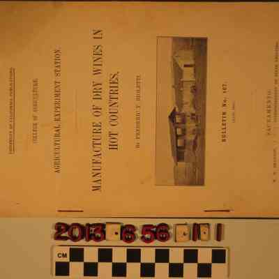"Manufacture of Dry Wines in Hot Countries," Frederic T. Bioletti, Bulletin 167, Agricultural Experiment Station, College of Agriculture, University of California, April 1905. The report has an introduction and sections of methods for improving dry wine manufacturing; amelioration of the character of the raw material; control of fermentation; and a summary. The work covers mainly French practices in that country and Algeria for comparison with California vineyards. With stains, edge tears, soiling, creasess and rubbing, the condition is fair overall.Lexicon