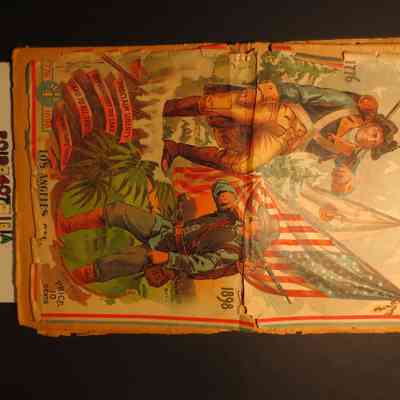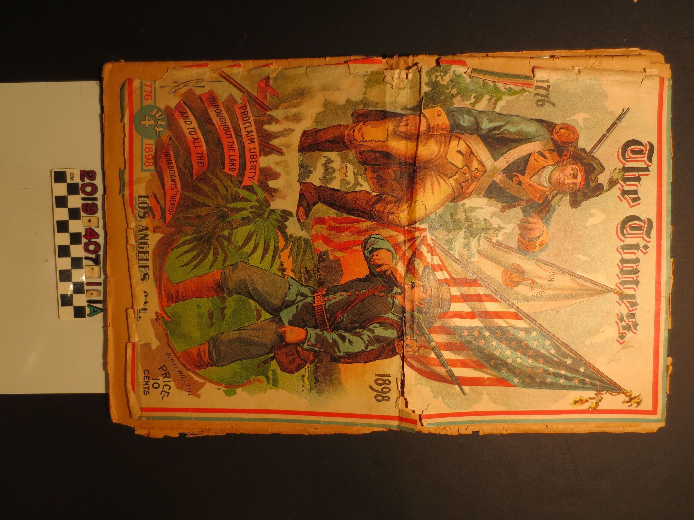 "Los Angeles Times," 4 July 1898. Inside are articles on Independence Day and the University of Southern California as well as a colored drawing of two soldiers, each with a musket over their shoulder, while the American flag and "Don't Tread on Me" flag are in the background and other drawings of flags, uniforms and soldiers. With detached covers, tears, and embrittlement, the object is in fair overall condition.