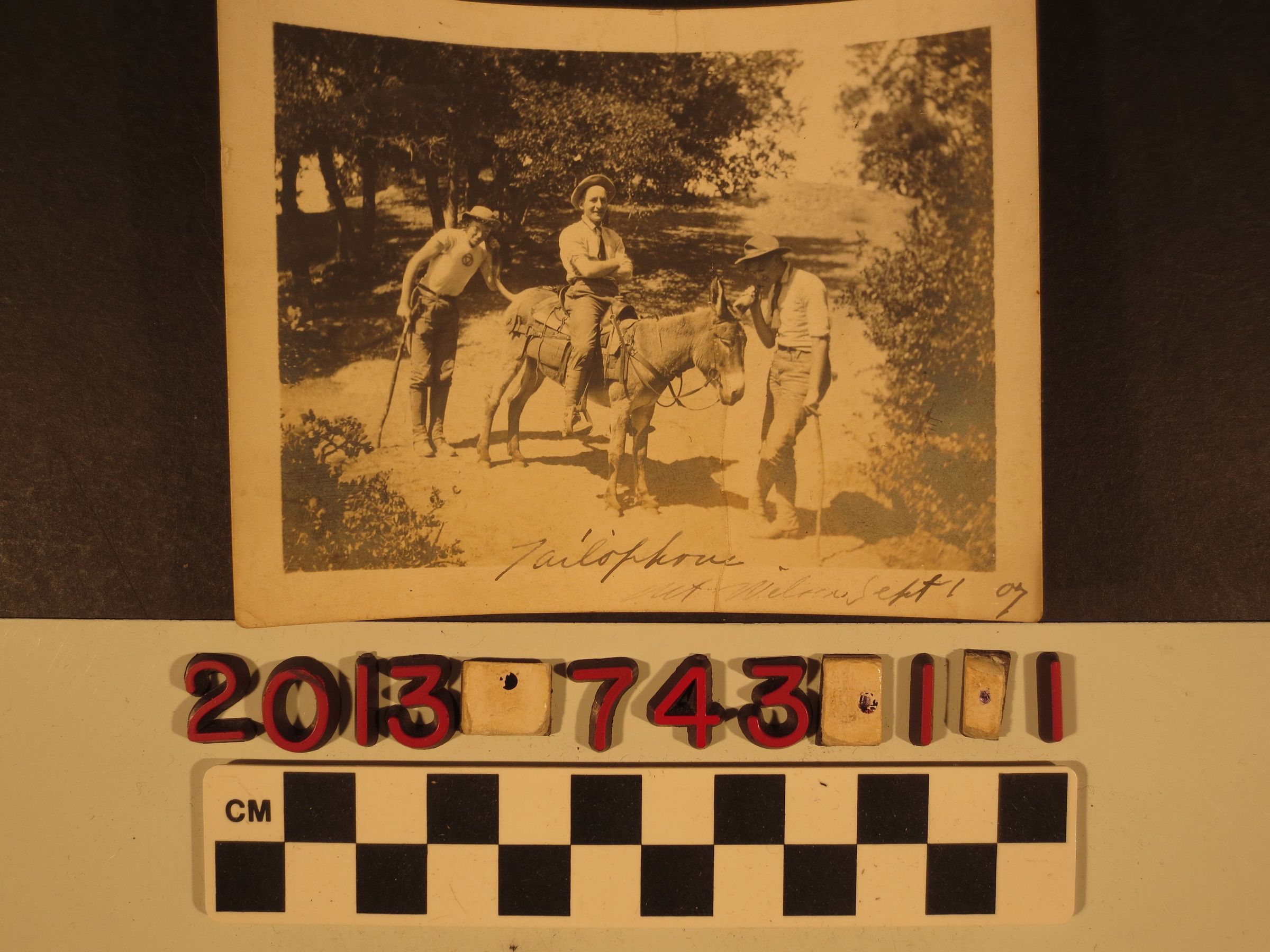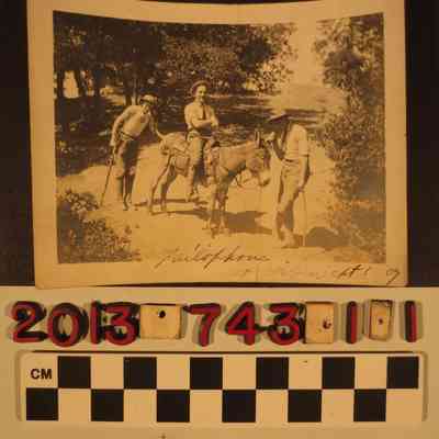 "'Tailophone' at Mt. Wilson, Sept 1, 07." The snapshot shows three men, one on a donkey, the other pretending to talk through the animal's ear and the third as if listening through its tail. Around the trio are on a dirt path with trees and a hillside. On the reverse in pen are "Grant / Anderson / Goodan." With major vertical creases, dented corners, soiling, yellowing, abrasions, and warping, the condition is fair.