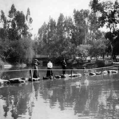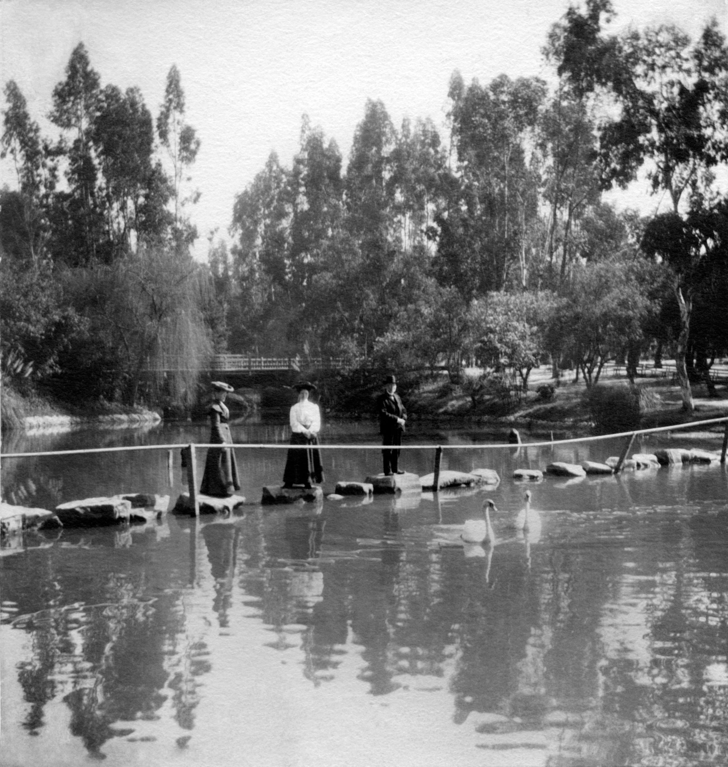 A snapshot photograph, "In a Los Angeles Park", ca. 1905. The image shows three persons (a man and two women) in formal clothes standing on rocks with a tow rope next to them in the middle of a lake. In the background is a bridge and a variety of trees. The reverse has a pencil inscription, "In East Lake Park / Los Angeles." With some light soiling and album paper residue, the condition is good.