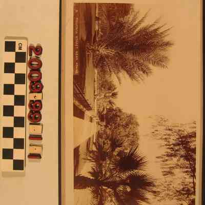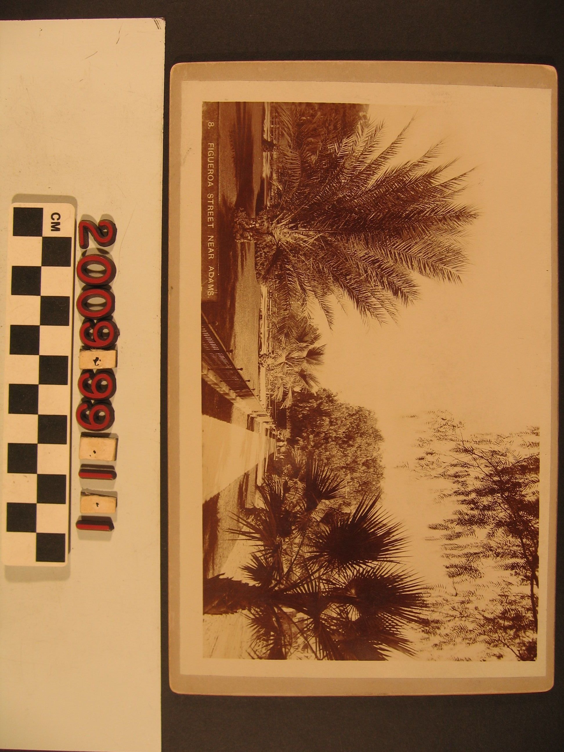 "8. Figueroa Street Near Adams," Los Angeles by C. C. Pierce, ca. 1900. The view shows a sidewalk, a grass median with palm and pepper trees; expansive lawns with grass and trees, including palm trees; and a portion of the unpaved Figueroa Street. No homes are visible. The caption is at the lower left. On the reverse is information about the Pierce studio, including his location and specialties. With some soiling and edge rubbing, the condition is good.