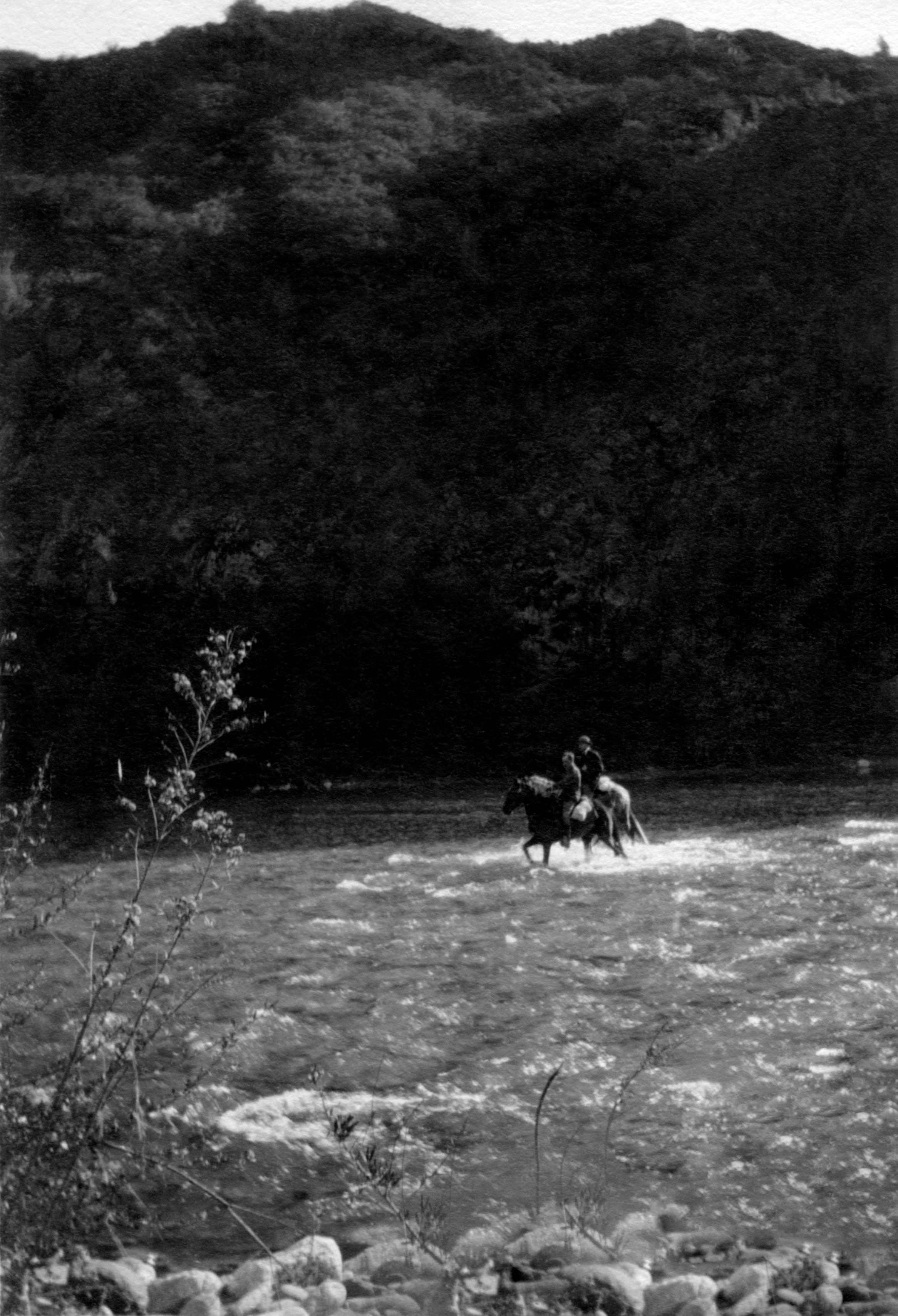 "San Gabriel in March 1916." The image shows a couple of horseback riders traversing the San Gabriel River. In the background is some vegetation and portions of the San Gabriel Mountains. At the bottom margin is the inscribed caption. With some photo album paper residue on the reverse and with light soiling, the condition is good.