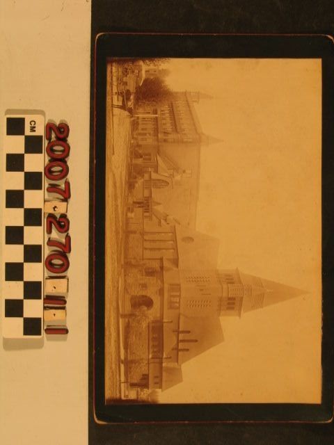 "7. First Evangelical Lutheran Church, Flower and Eighth Sts," Los Angeles, S. J. Milliken [probably Seymour J.], ca. 1890. The image, part of Milliken's "View of Los Angeles and Vicinity" series of sixty-one images, shows the Romanesque Revival church at a corner, with an attached portion (likely the rectory), a separate home, and a three-story commercial structure completing the block. At the let there is a parked horse-and-buggy and portions of Flower and Eighth strees. The reverse gives the series name, list of images, prices, and contact information. There is a stamp from the Hazard-Dyson Collection and a pencil inscription reads "No Neg." A seymour J. Miliken was in the Los Angeles city directory in 1888-90 living on the north side of Second Street and the address on back of the mount is 214 W. 2nd St. With soiling and some fading to the image and soiling, stains, and edgew wear to the mount, the overall condition is fair.Lexicon