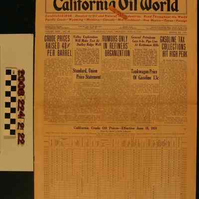 "California Oil World," 25 June 1931 (Vol. XXIII, No. 48), published in Los Angeles. The journal is most concerned with news and developments in oil fields in the Greater Los Angeles area, although there is some for outlying areas. There are some photographs, tables and charts, and other illustrations as well as industry-related advertisements. With some browning, creases, a taped tear at the right of the front page, edge rubbing, dented corners, and a horizontal half-fold, the condition is fair.Lexicon