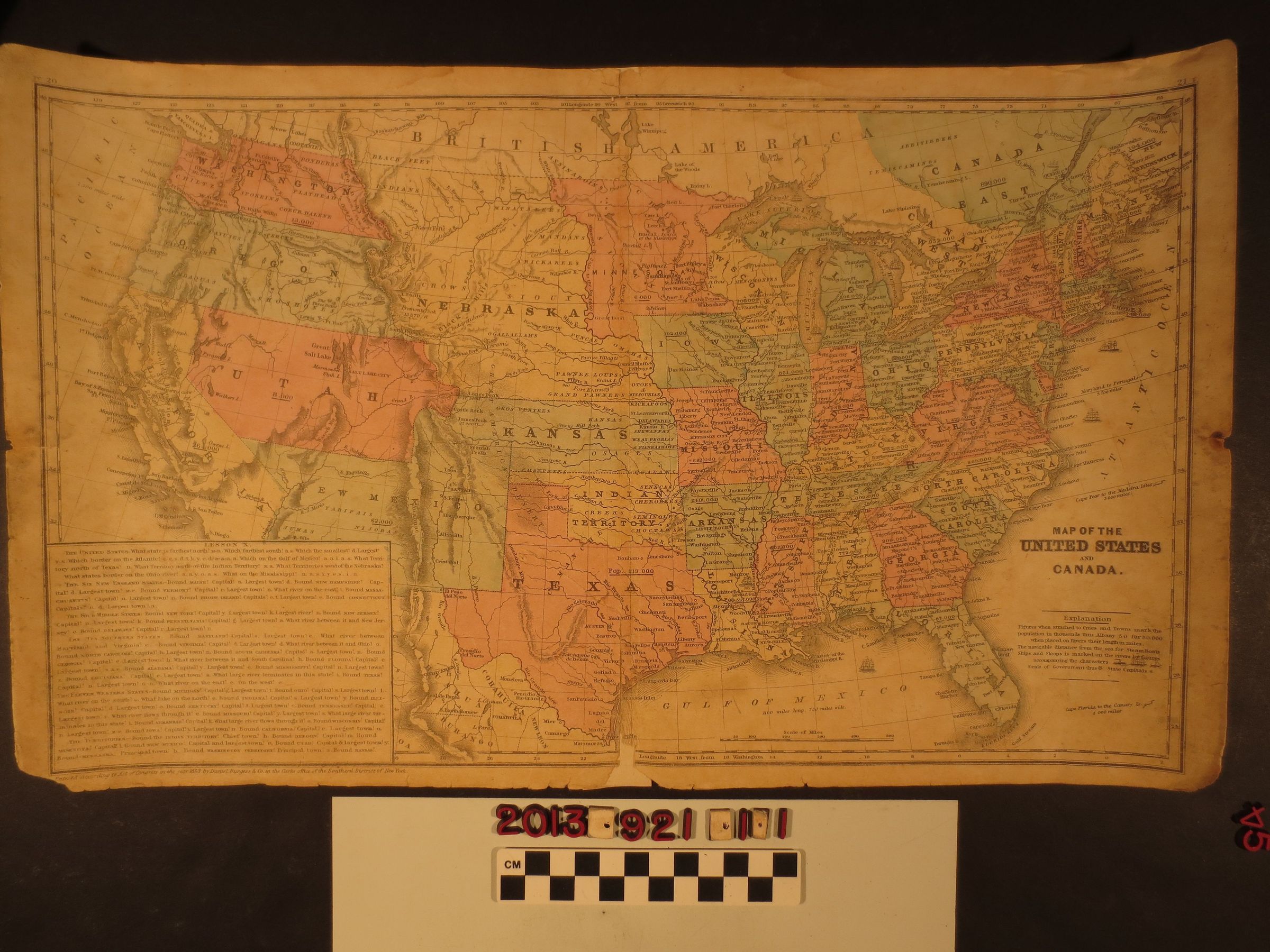 "Map of the United States and Canada," Daniel Burgess and Company, 1853. The item, part of a textbook and having a lesson box at the bottom left, shows the states and territories of the U.S. in several colors, including California and the various western territories (including the "Indian Territory" later Oklahoma) with different boundaries than what developed in succeeding years. Despite the map's title, very little of "British America" or Canada is shown. With edge tears, missing corner pieces and sections at the center fold (at the back of which is archival tape), stains and heavy soiling, the condition is fair overall.Lexicon