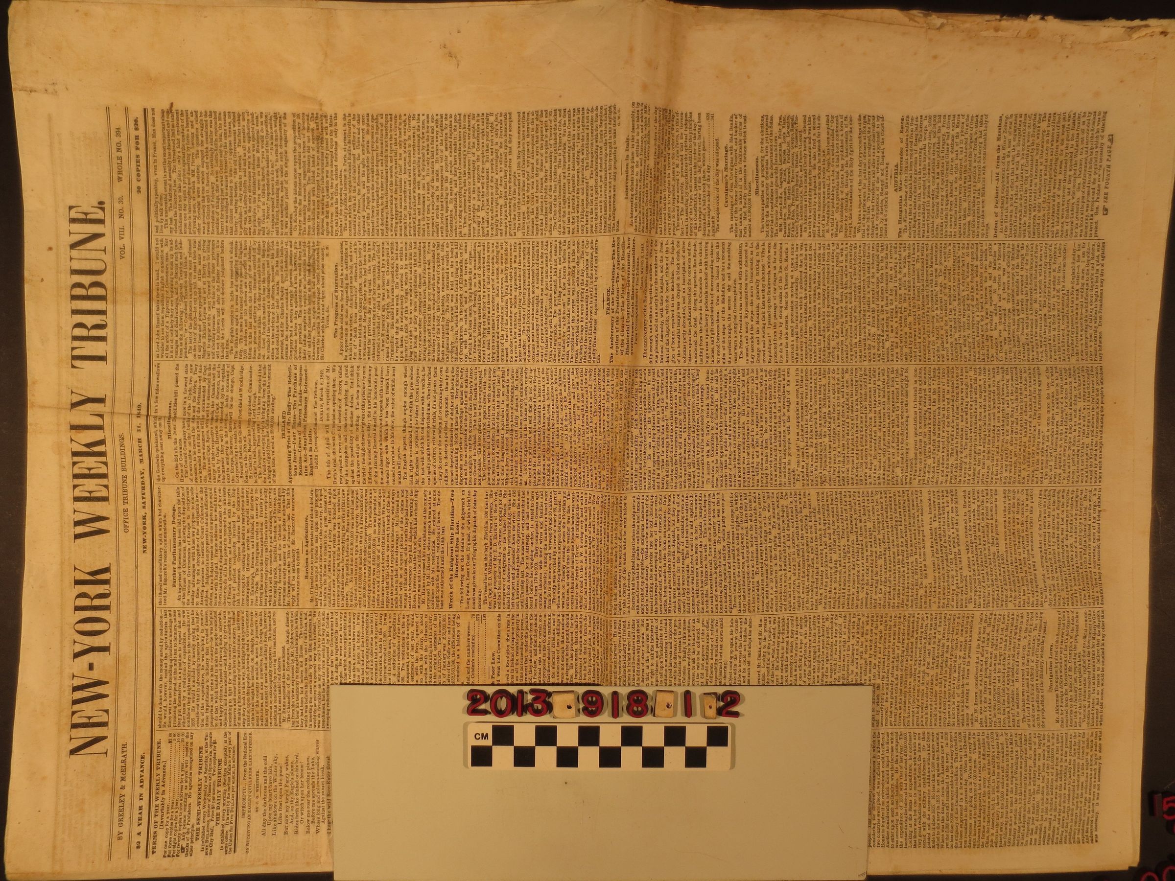 "New-York Weekly Tribune," 31 March 1849. In addition to local, regional, national and international news, the paper has much material on the recent discovery of gold in California and the rush of miners to the new American possession as well as an editorial on why it had not been "organized" by the federal government. With creases, dog-earned corners, foxing, folds and soiling, the condition is fair overall.Lexicon