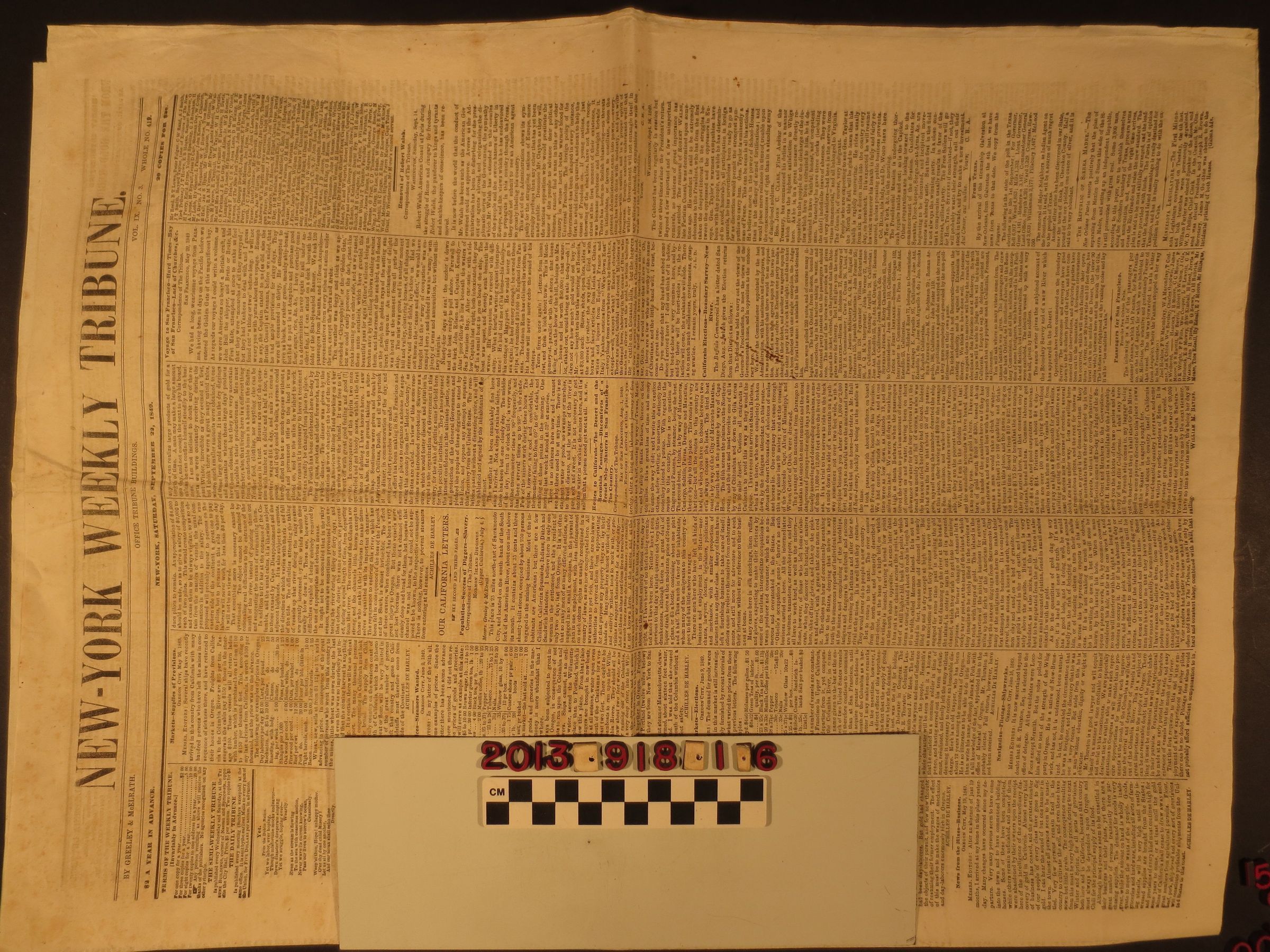 "New-York Weekly Tribune," 22 September 1849. In addition to local, regional, national and international news, the paper has significant material on the recent discovery of gold in California and the rush of miners to the new American possession, as well as other California news and material on routes to the coast. With creases, dog-earned corners, foxing, folds and soiling, the condition is fair overall.Lexicon