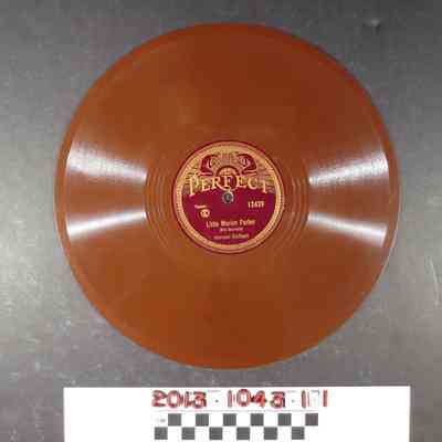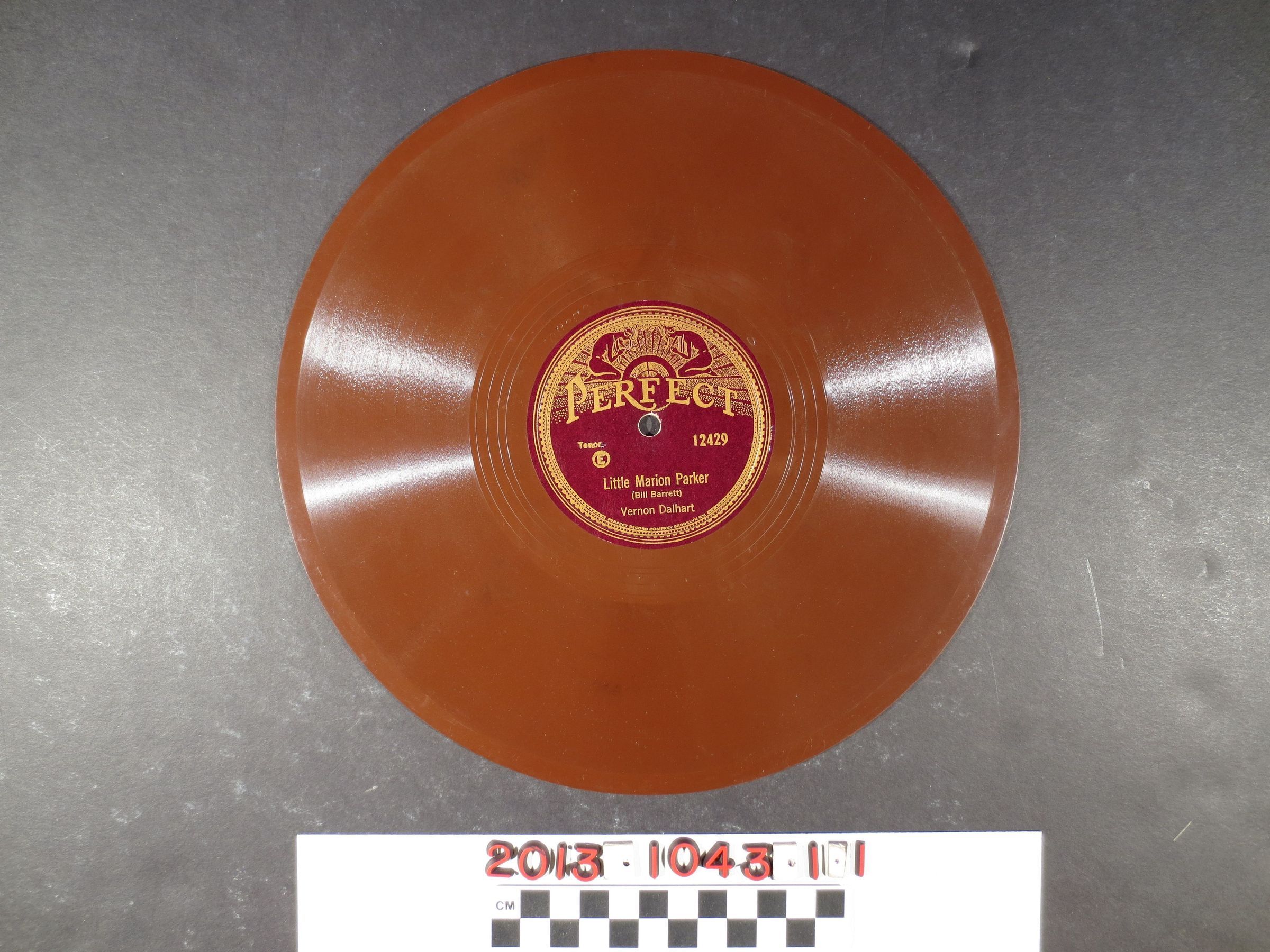 "Little Marion Parker" b/w "Six Feet of Earth," performed by Vernon Dalhart on the A-side and Dlahart and Carson Robison on the B-side, 12429, Perfect Records, recorded 9 March 1928. "Little Marion Parker," written by Bill Barrett, commemorated the 1927 murder of a girl in Los Angeles by William Hickman, who was later executed for the crime. "Six Feet of Earth" by the McCravy [misspelled McCravey on the record) Brothers, Frank and James, had been recorded by the two for Victor in July 1927 and were well-known for their 1929 song, "Will The Circle Be Unbroken." Dalhart was a very popular singer during the 1920s in what could be viewed as part of country music genre. The label has almost no indication of wear and the condition is assumed to be good, though Perfect records are known for low quality.Lexicon