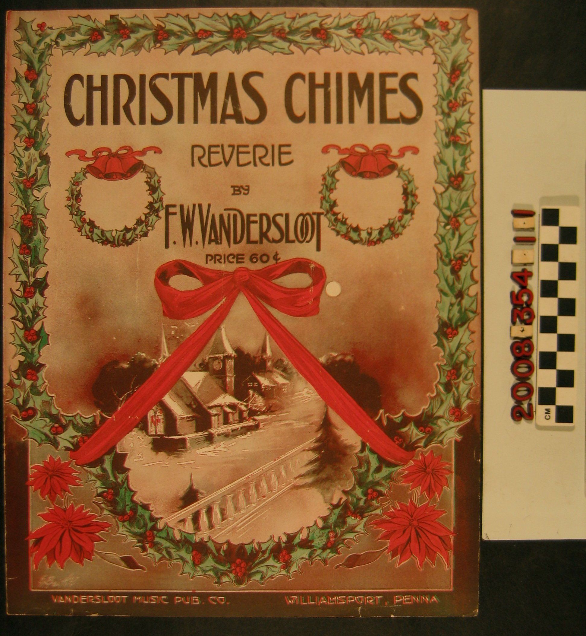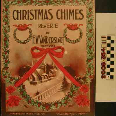 "Christmas Chimes Reverie," by F. W. Vandersloot, published by Vandersloot Publishing Company, Williamsport, Pennsylvania, 1915. The cover has a holly border within which are holly wreaths topped with bells, a red bow, poinsettia flowers, and a wintry village scene. The score, in very slow tempo with a "Chimes imitation" is accompanied by an ad for another song by the publisher. With some creases, edge rubbing, and a little soiling, the overall condition is good.
