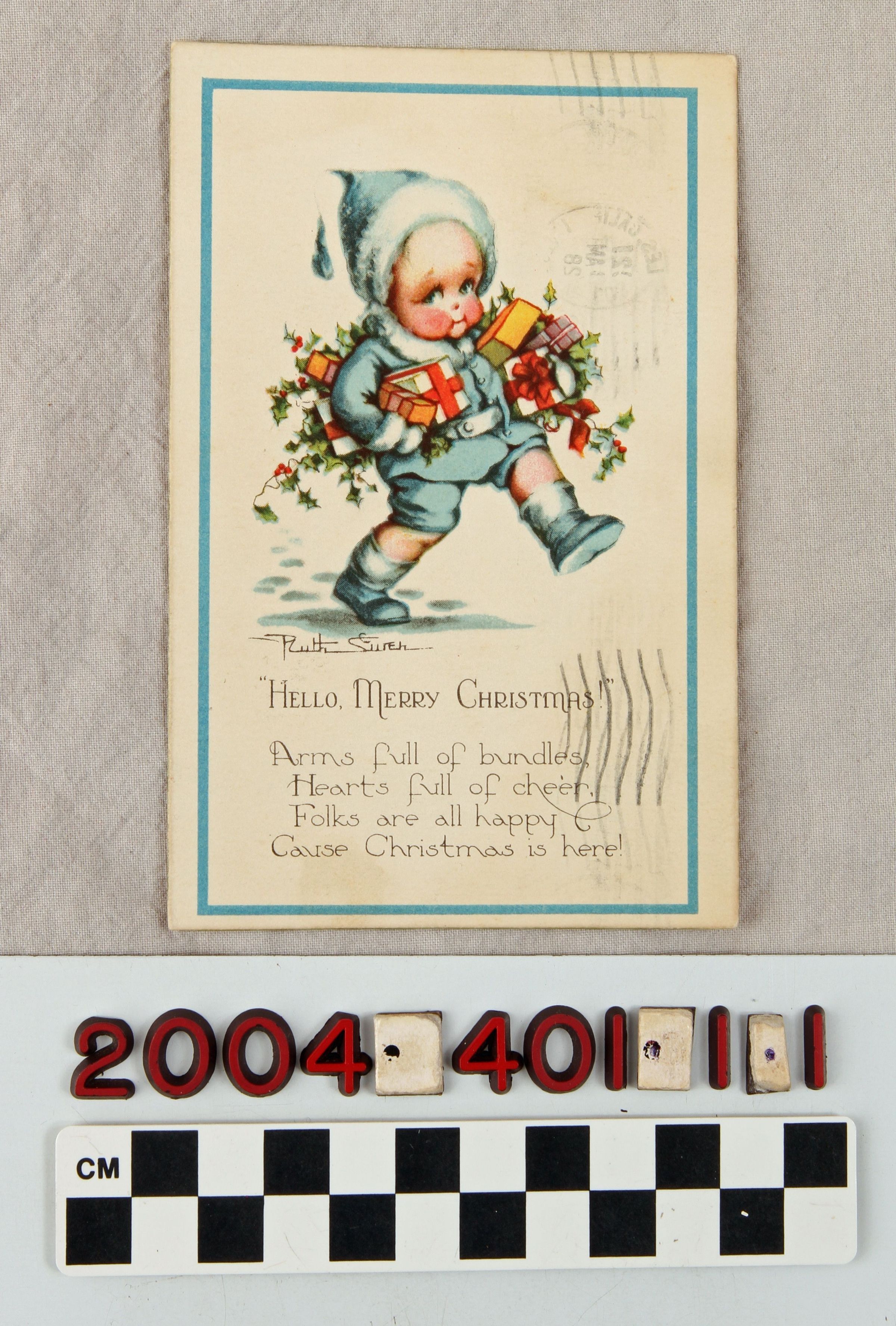 "HELLO, MERRY CHRISTMAS" POSTCARD, 1928. The front of the postcard has a blue striped border with a colored drawing of a child holding gifts and mistletoe. To the bottom of the drawing is the artists signature and a holiday greeting. There is also a postal mark to the right side. On the reverse side to the upper right corner is a one cent postage stamp. There are spaces for a message and an address. The postcard was postmarked on December 21, 1928 in the city of Los Angeles. It is in good condition despite having minor abrasion damage, adhesives, surface soiling, discoloration, inscriptions and stains.
