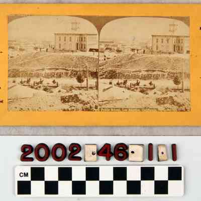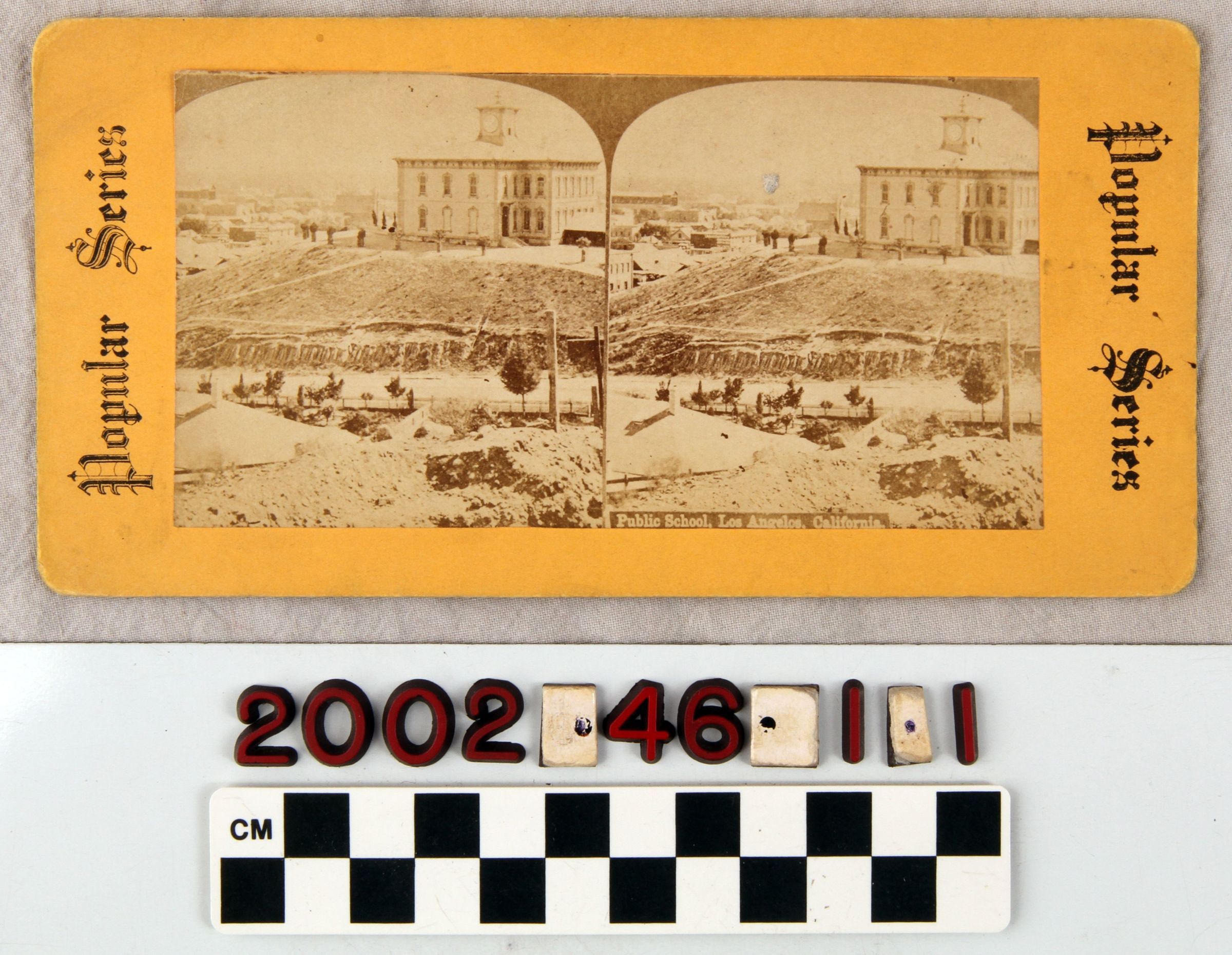 A stereoscopic photograph,"Public School, Los Angeles, California", ca. 1870s. The image is mounted on a yellowed card with the words "Popular Series" (a pirated series taken from an earlier published view) in script on the left and right edges. The view appears to be from Fort Street (later Broadway) and looking to the southeast. The school, at right, is a two-story wood structure with a tower or cupola at the center. An entrance is at the lower right of the first floor with a set of stairs leading to it. It is difficult to make our further details, either in the foreground near where the photographer stood or in the background cityscape. In good condition, the artifact has something adhered to the right image, just left of the school building. There are also corner dents, some surface soiling, and the photo has come loose at the top left.Lexicon
