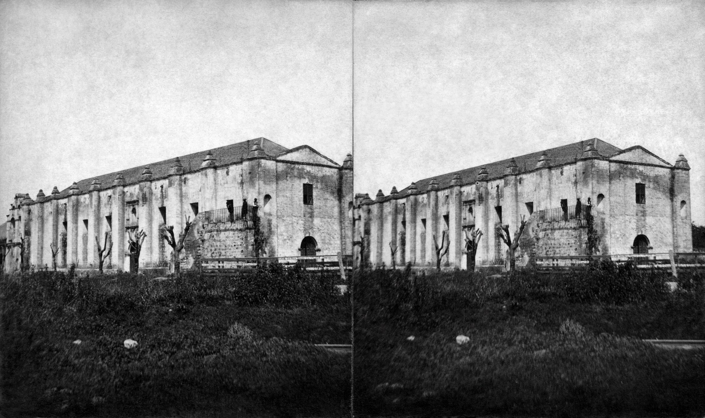 "Old Mission Mexican Church / San Gabriel Los Angeles / Co. Cal," by O. E. Tyler, 1880s The view is from the southeast just across the Southern Pacific Railroad tracks looking at the eastern entrance and southern facade. The stairs leading up the east end of the latter are in view as are some denuded trees. On the reverse is the title handwritten in ink. With stains and soiling, including on the image, as well as edge rubbing, the condition is fair.Lexicon