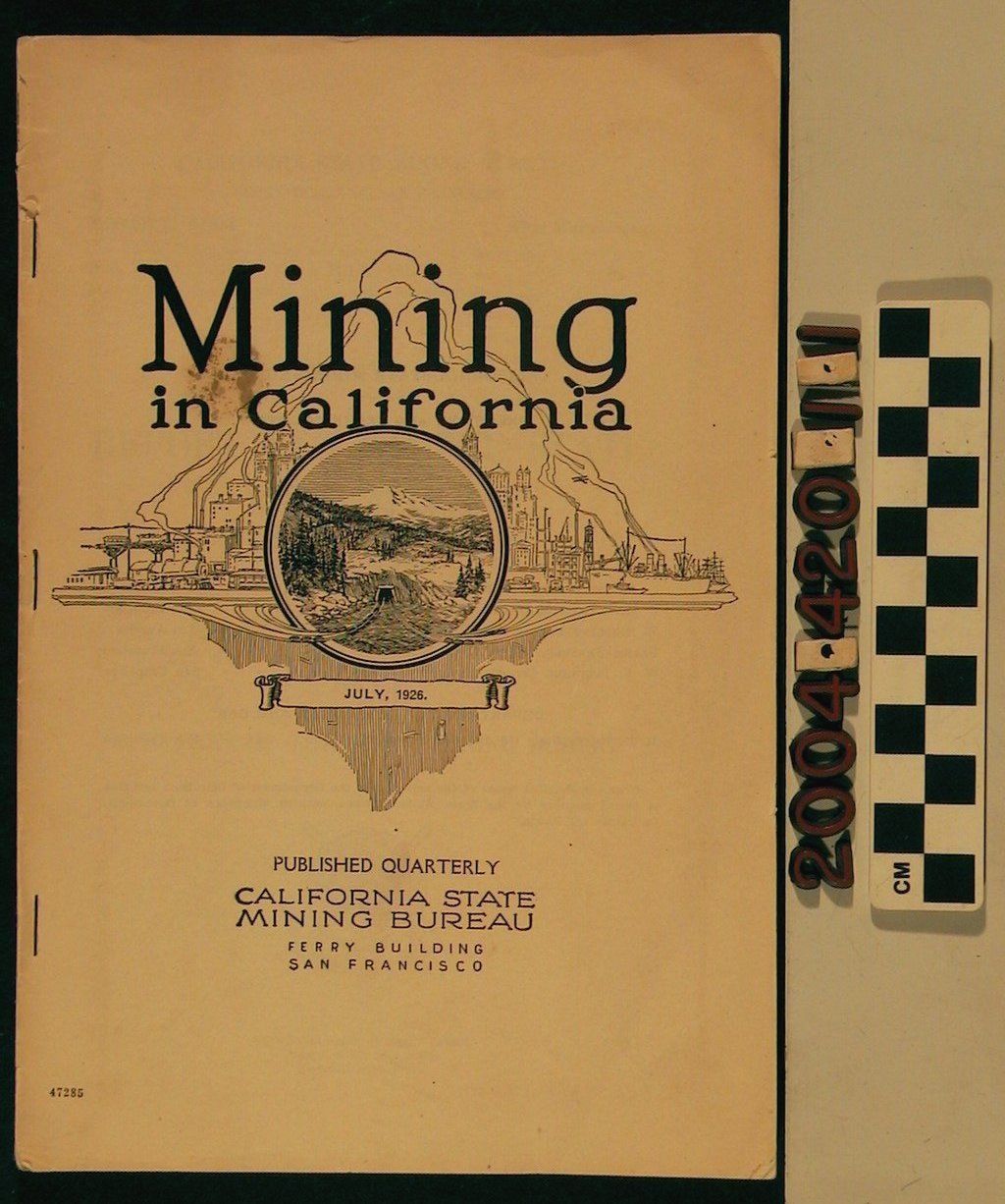 "MINING IN CALIFORNIA," JULY 1926. The magazine has collected engineer reports regarding the Sacramento, San Francisco, and the Los Angeles division. Also reported are the counties of Marin, Sonoma. In addition, there are articles pertaining to oil, copper and other areas of interest within the mining field. Statistics and a property map of the Petaluma District are included as well as a map of California with the mining boundaries shown. Other sections include information regarding the Museum of the State Mining Bureau, and other various publications. The magazine has damages which include creases, folds, minor losses, stains and tears. It is in overall good condition.Lexicon