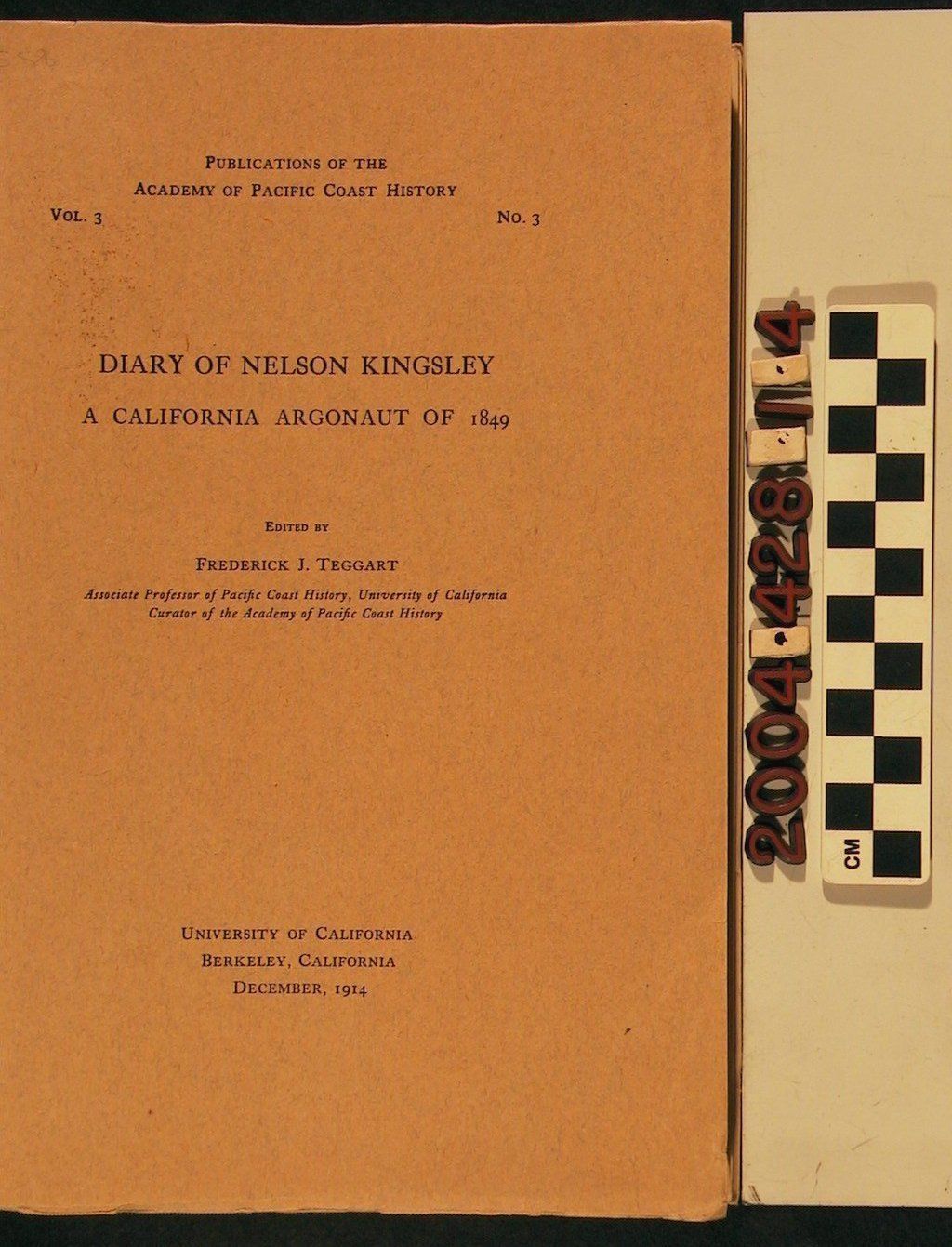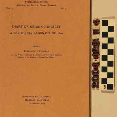 The original 207- page diary written by Nelson Kingsley gives a first hand account of his experience as a "Forty-Niner," mining for gold in California during February 9, 1849 to March 4, 1851. Kingsley describes his experience from his departure at sea aboard the Anna Reynolds from his native state of Connecticut through his struggles in California. This 1910 edited version was edited by Frederick J. Teggart. It is in good condition with only minor damages found that range from creases, light surface soiling, discoloration, stains and tears.Lexicon