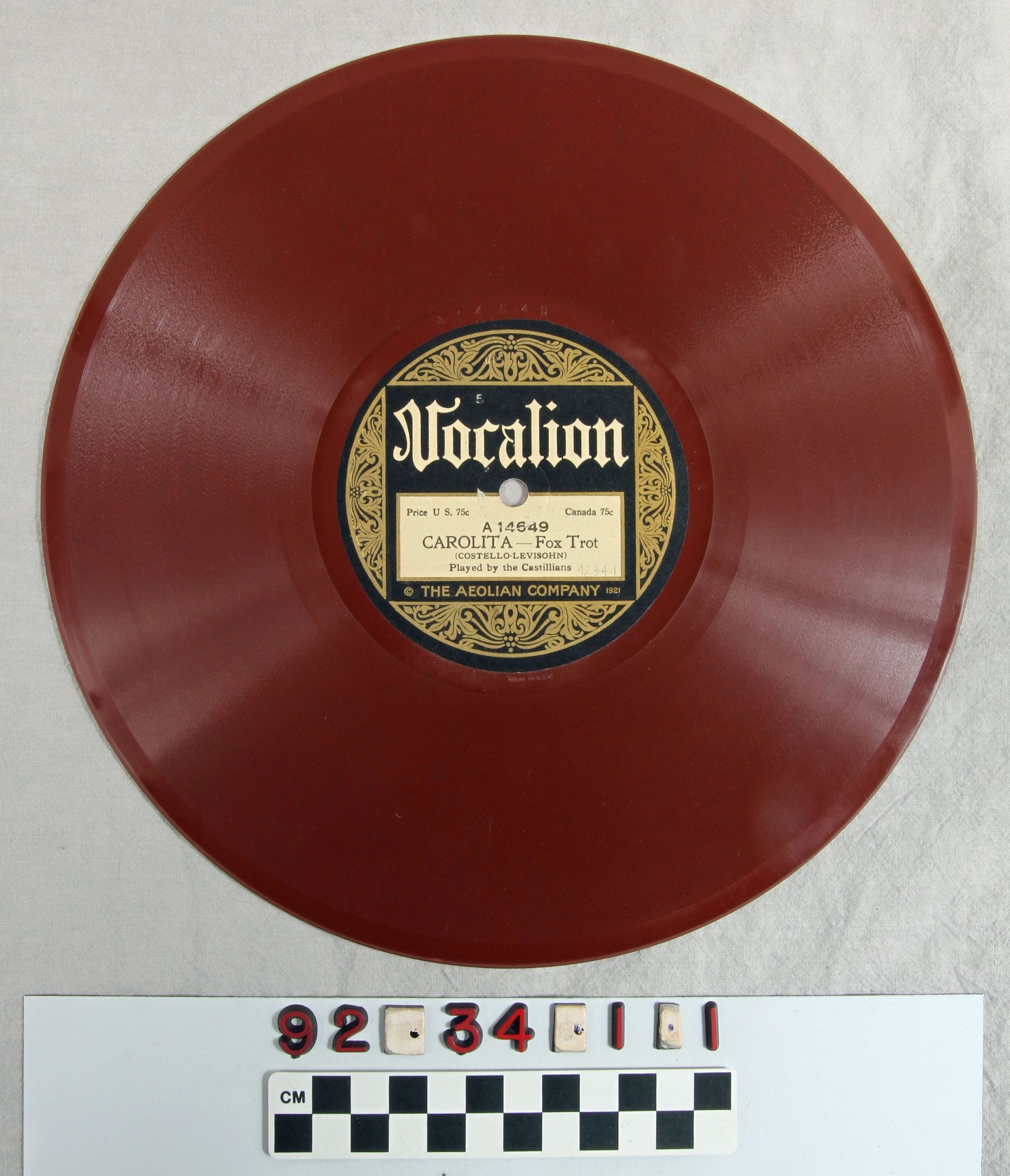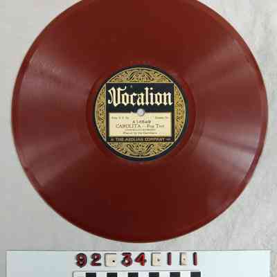 Rust colored record with gold and black printed label in center, two-sided, side A features Carolita - fox trot and side B features Sweet Carmen - tango. On side B - "Vocalion"/PRICE U.S. 75c CANADA 75c/B 14649 SWEET CARMEN/TANGO/(ARTHUR)/PLAYED BY MAX DOLIN'S ORCHESTRA/THE AEOLIAN COMPANY 1921"; side B - "VOCALION/PRICE U.S. 75c CANADA 75c/A 14649/CAROLITA - FOX TROT/ (COSTELLO-LEVISOHN)/PLAYED BY THE CASTILLIANS/THE AEOLIAN COMPANY 1921".