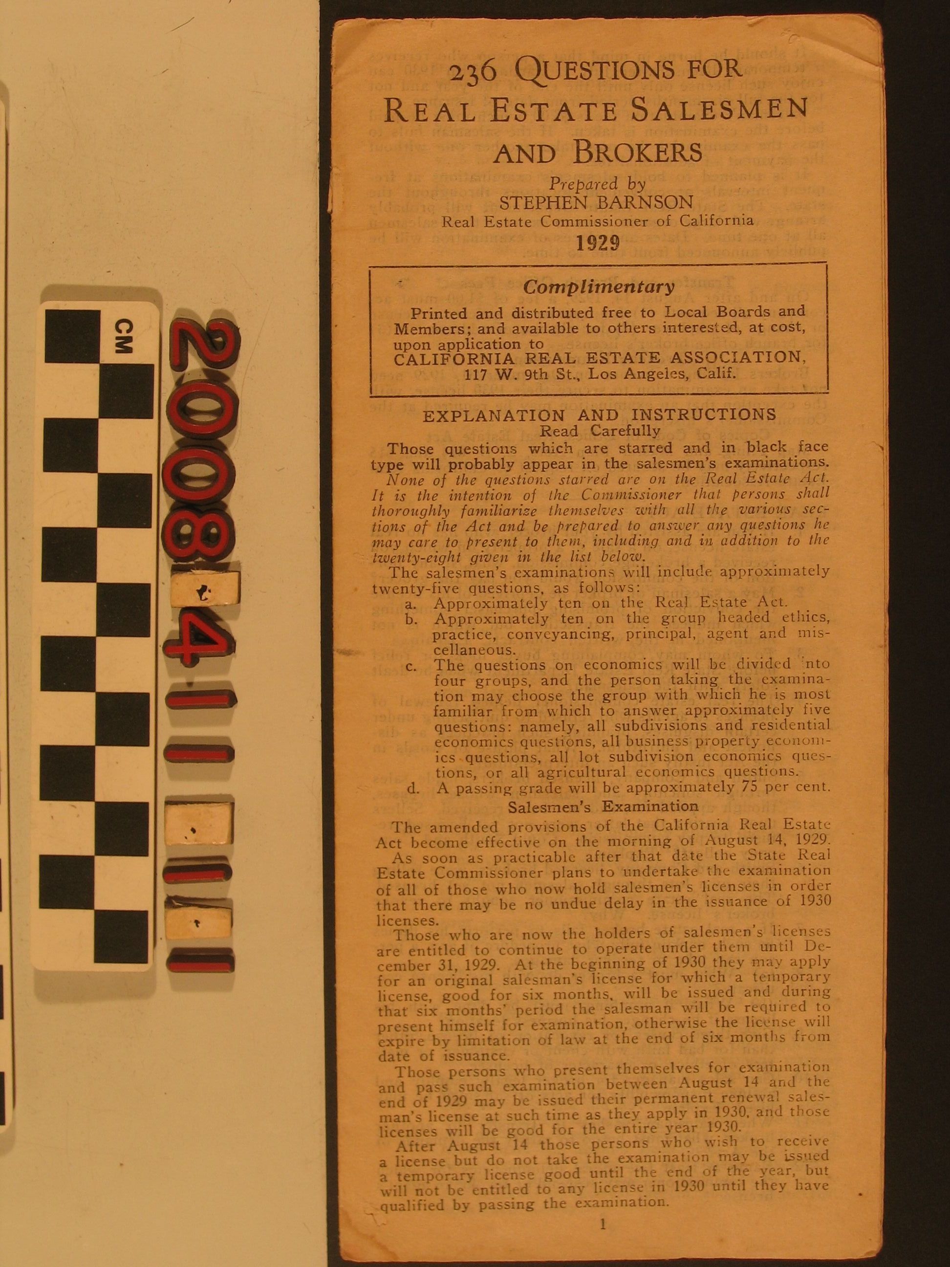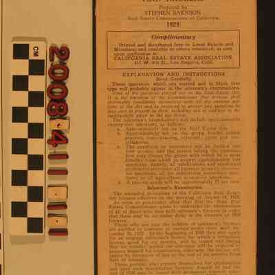 "236 Questions for Real Estate Salesmen and Brokers," prepared by Stephen Barnson, Real Estate Commissioner of California, 1929. The complimentary publication for members of the California Real Estate Association, has an explanation and instructions section, followed by the questions that were drafted in May as part of the state examination for salesmen and brokers, following provision of the state Real Estate Act of 14 August. There is browning, some stains, soiling, and creases, so the condition is fair.