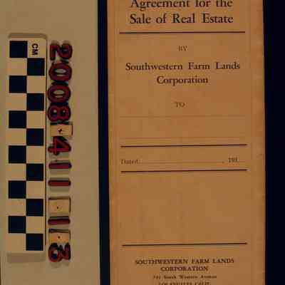 "Agreement for the Sale of Real Estate," a printed real estate contract from Southwestern Farm Lands Corporation, Los Angeles, 1930s. The unused item has standard text for the deeding of real property with spaces for names of parties, dates, descriptions of property, and others for lands in Yuma County, Arizona. With browning, soiling, some stains, creases, and edge rubbing, the condition is fair.Lexicon