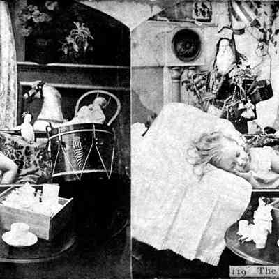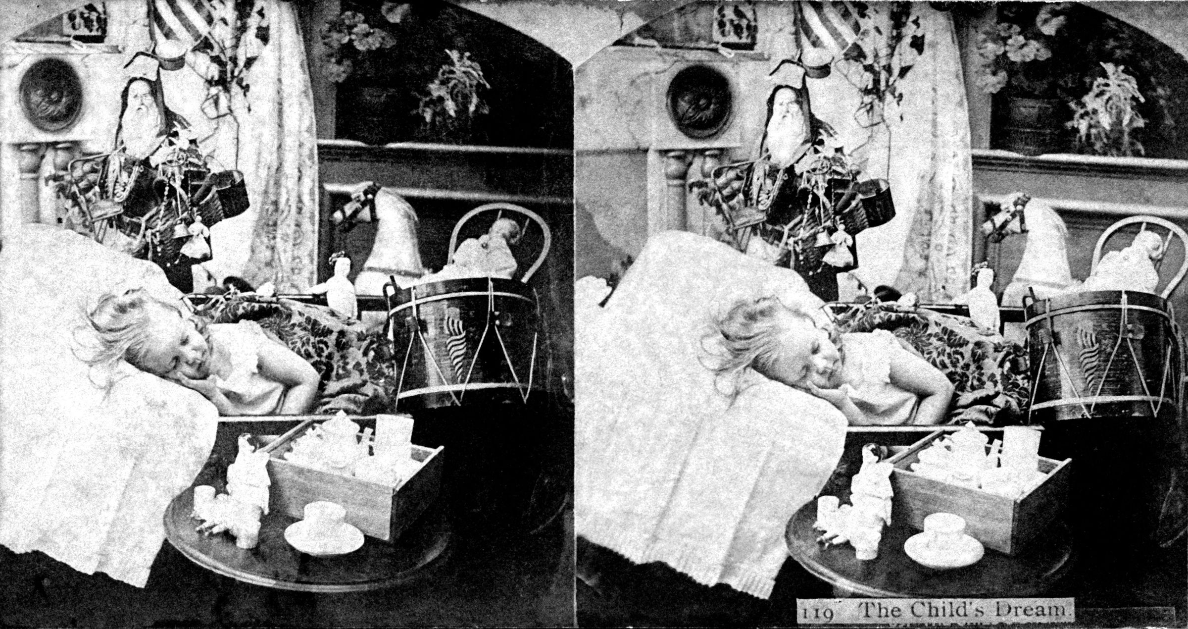 "119 The Child's Dream," from a "Group Series," ca. 1890s. The image shows a sleeping child in bed with an image of Santa Claus and toys, including dollsa, a drum, a rocking horse, and others around her. With soiling, stains at the top and reverse and lower left and edge rubbing, the overall condition is fair.Lexicon