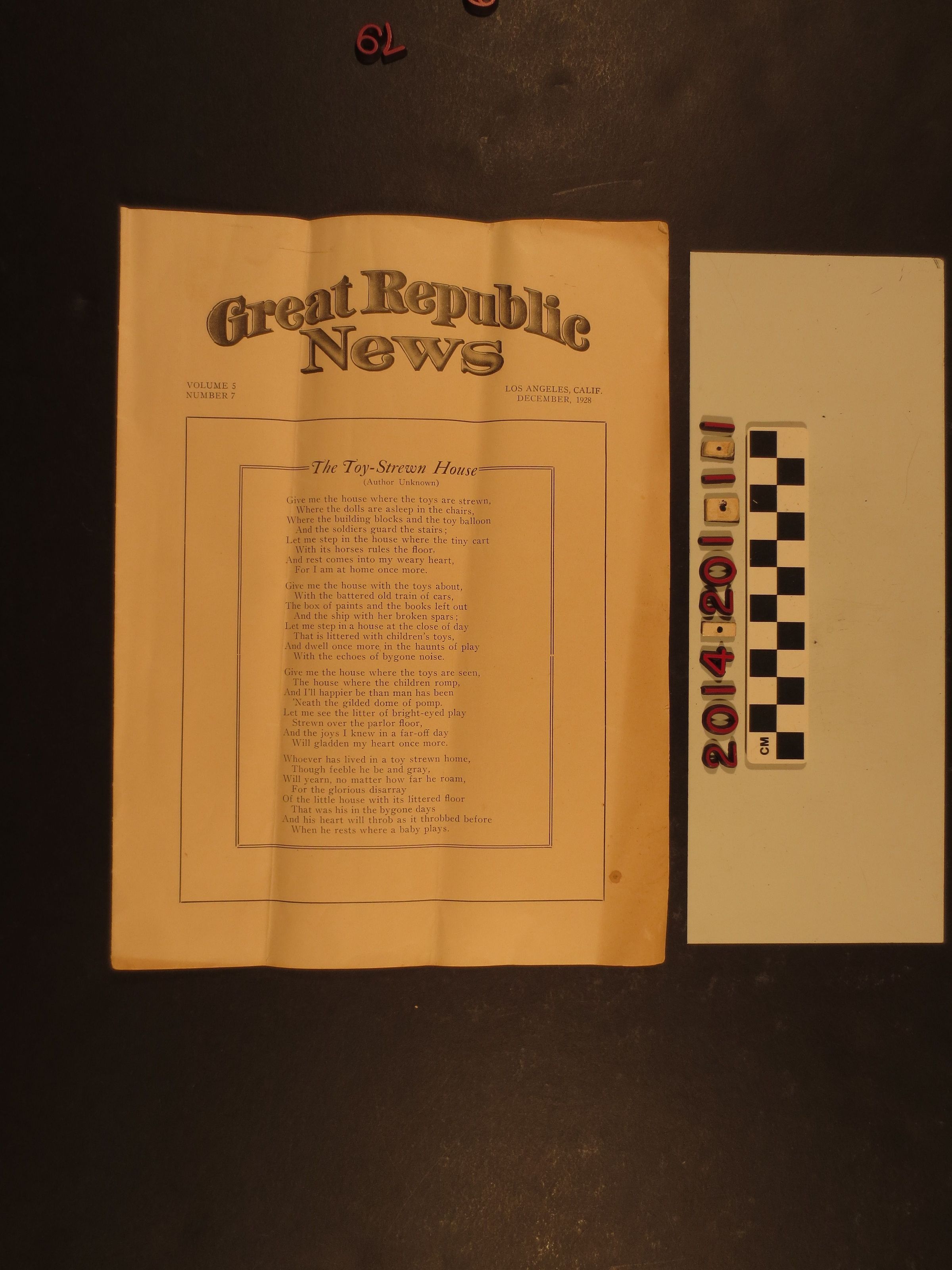 Pamphlet, "Great Republic News," Vol. 5, No. 7, December 1928. Published monthly by the Great Republic Life Insurance Company and editor Frederick E. Dudley. Features poetry, jokes, small pieces of fiction and general company news. In good condition, heavily folded, moderate acid burn to covers.Lexicon