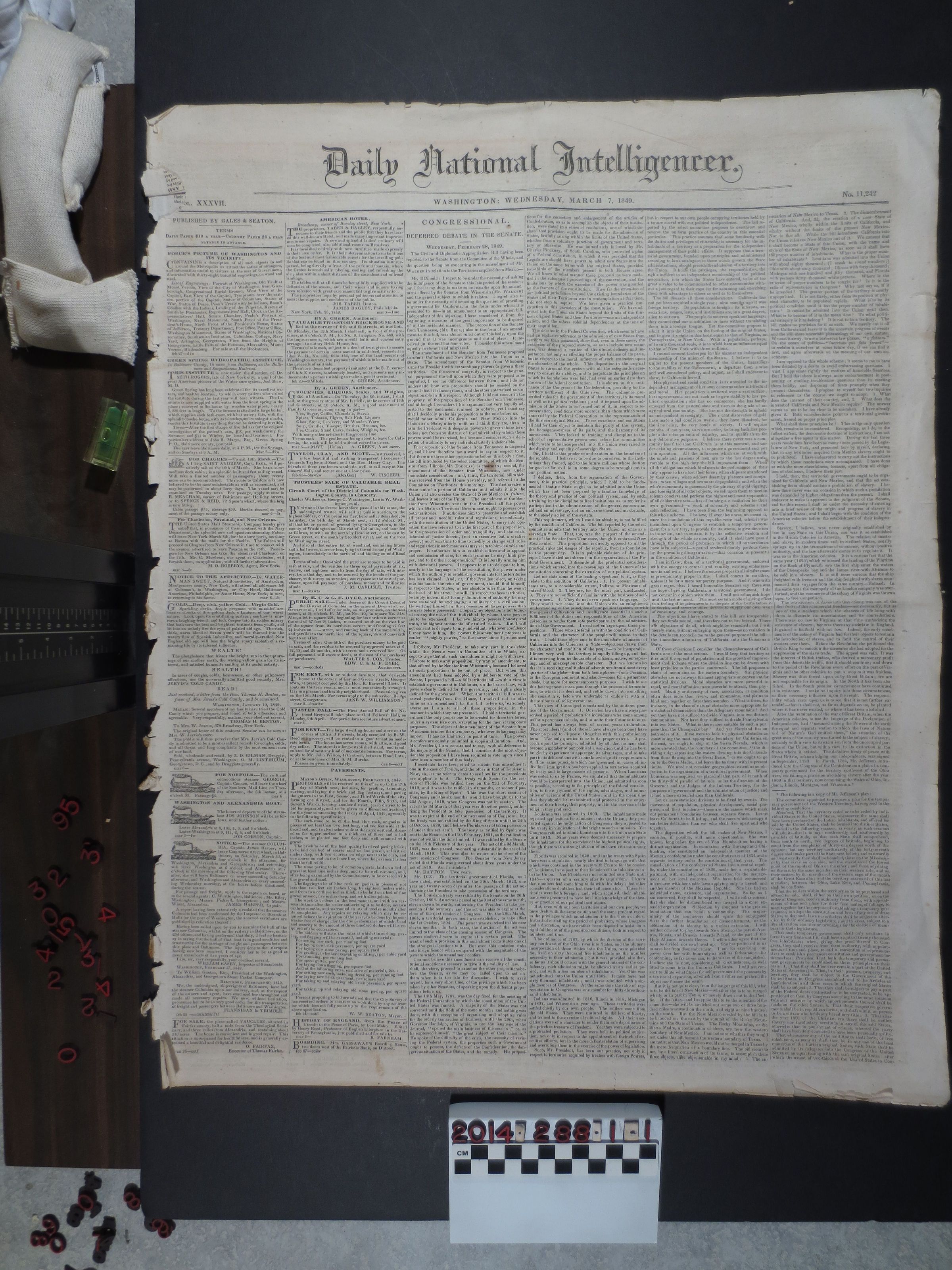 "Daily National Intelligencer," Vol. XXXVII, No. 11242, 7 March 1849. Folio published in Washington. Main article on the front page regarding the Civil and Diplomatic Appropriation Bill. Discussion centers of California's statehood, self government, prohibition on slavery in California and New Mexico. Includes a copy of Thomas Jefferson's Western Plan with a vote on the anti-slavery clause by state representatives. Also includes advertisements and lottery prize amounts. In fair condition, tattered fold, edge tears, creases.