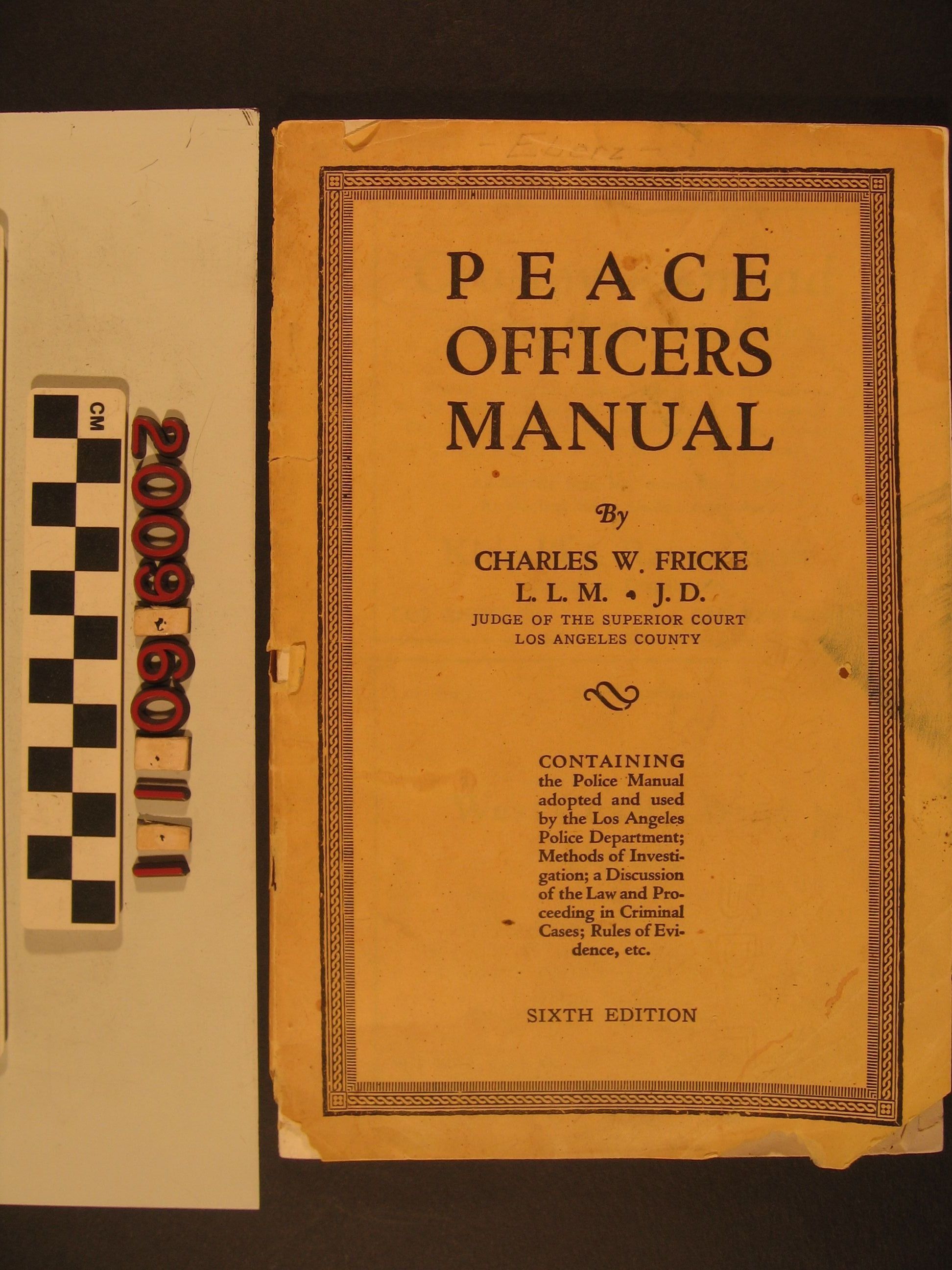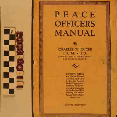 "Peace Officers Manual," Charles W. Fricke (Sixth ed.,, Los Angeles: Los Angeles Review,) 1929. The pamphlet, by a Superior Court judge, discusses how criminal cases reach the courts; the American jury system; the process of rendering verdicts; selecting trial juries; the concept of reasonable doubt; bail; sentencing; parole and probation; new trials and appeals; the California Vehicle Act; various types of crimes; court jurisdictions; evidence; investigations and arrests; and search warrants and subpoenas. There is an index and many advertisements. With losses, heavy staining, puncture marks, creases, and other wear to the wrappes, but generally clean pages, the condition is fair overall.Lexicon