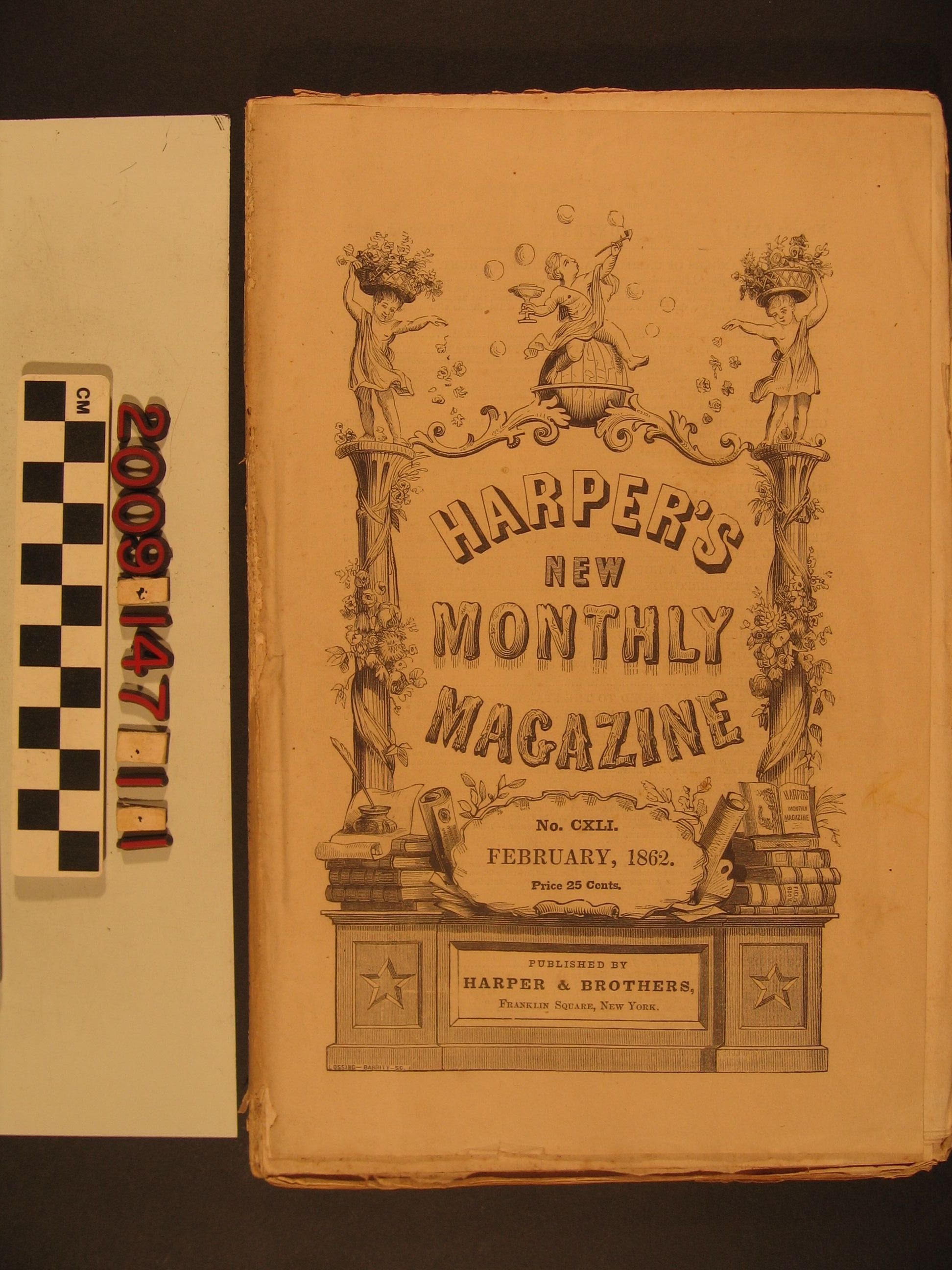 "Harper's New Monthly Magazine," Vol. XXIV, No. CXLI, February 1862, published by Harper & Brothers, New York. The item contains fiction, poetry, articles on current events, editor's sections, and foreign news. The feature article, with several illustrations, is part five of J. Ross Browne's "The Coast Rangers," a humorous account of Browne's journeys in California. With the spine severely chipped and stains, edge rubbing, soiling and creases, the overall condition is fair.Lexicon