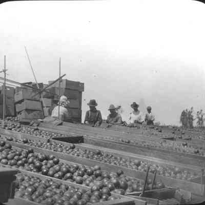 "5792 Orange picking, San Gabriel Valley," published by Williams, Brown & Earle, Philadelphia, ca. 1910s. The image shows several men, probably Mexicans, working with fruit in long slightly angled boxes, while stacks of packing crates are off to the left. The condition appears to be good.Lexicon