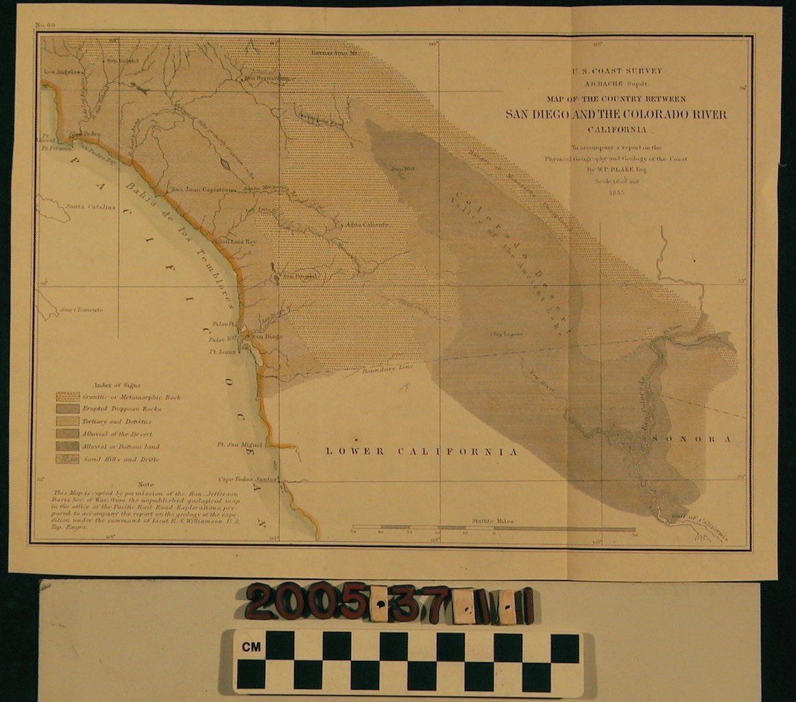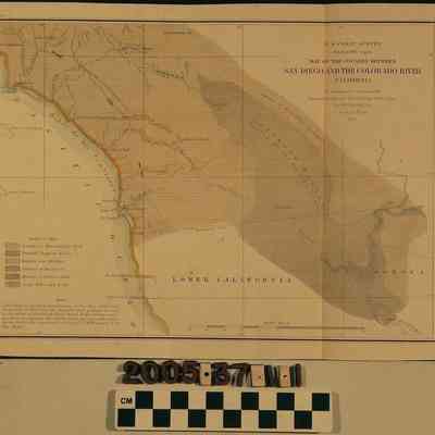 The map is a United States coast survey which seems to have been prepared for the purpose of railroad expansion planning. It covers portions of Southern California with specific areas shown such as Los Angeles, San Bernardino, San Pedro, San Juan Capistrano, San Luis Rey, San Diego, as well as a section of Sonora, Mexico. Jefferson Davis, Secretary of War, granted permission for the copy in which the original was made from the Pacific Railroad Explorations files. A legend is given for the various types of terrain present and a statute mile scale. It is in good condition with only minor paper creases, discoloration and foxing.Lexicon