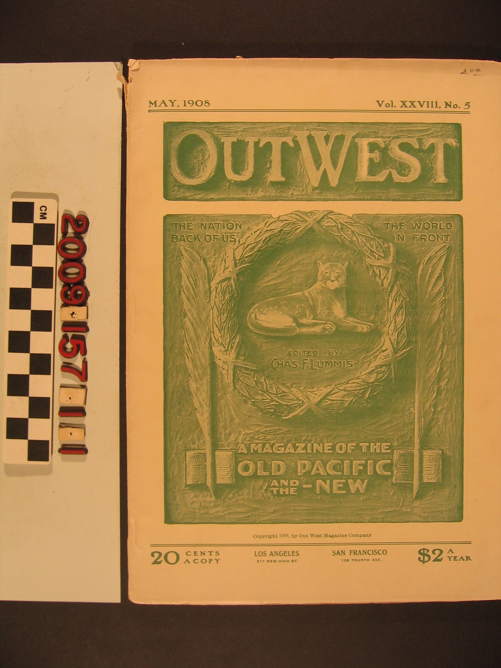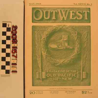 "Out West," Vol. XXVIII, No. 5, May 1908, published by Out West Magazine Company, Los Angeles. The item features fiction, poems, regular features and an article by James M. Guinn in early California industries (such as silk-raising, castor beans, a woolen mill, and cotton). There are many illustrations and advertisements to the item, which has some browning, small tears and soiling to the wrappers and many untimmed and generally clean pages, so the condition is good overall.Lexicon
