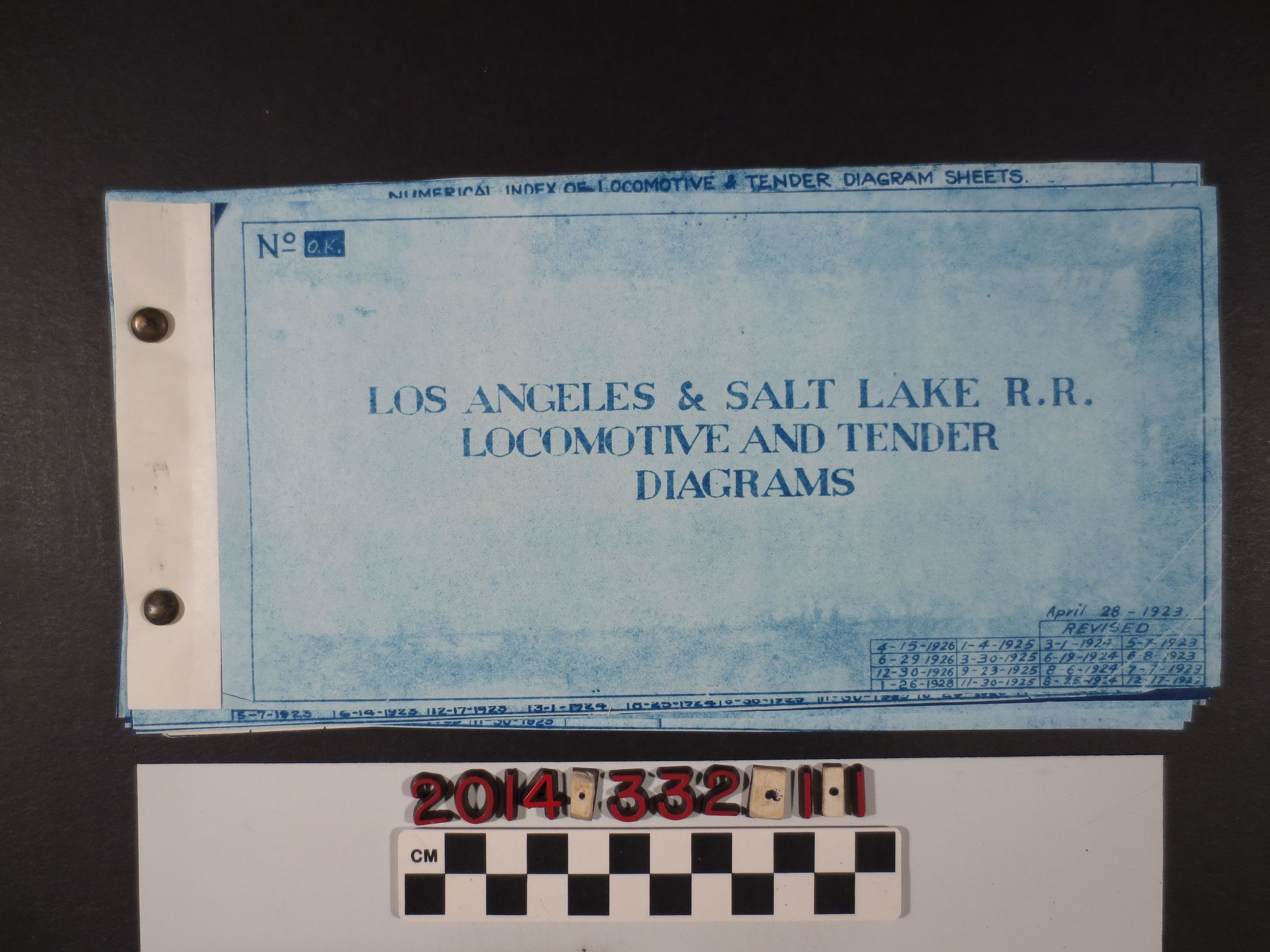 "Los Angeles and Salt Lake R.R. Locomotive and Tender Diagrams," last revision on 26 January 1928. Printed in blue ink and bound with two metal brads at the left edge, the pamphlet includes an index at the front listing the diagram sheets and revision dates followed by diagrams labeled with measurements, materials and parts of train cars. The railroad booklet is in good condition with a minor tarnish to the metal brads.